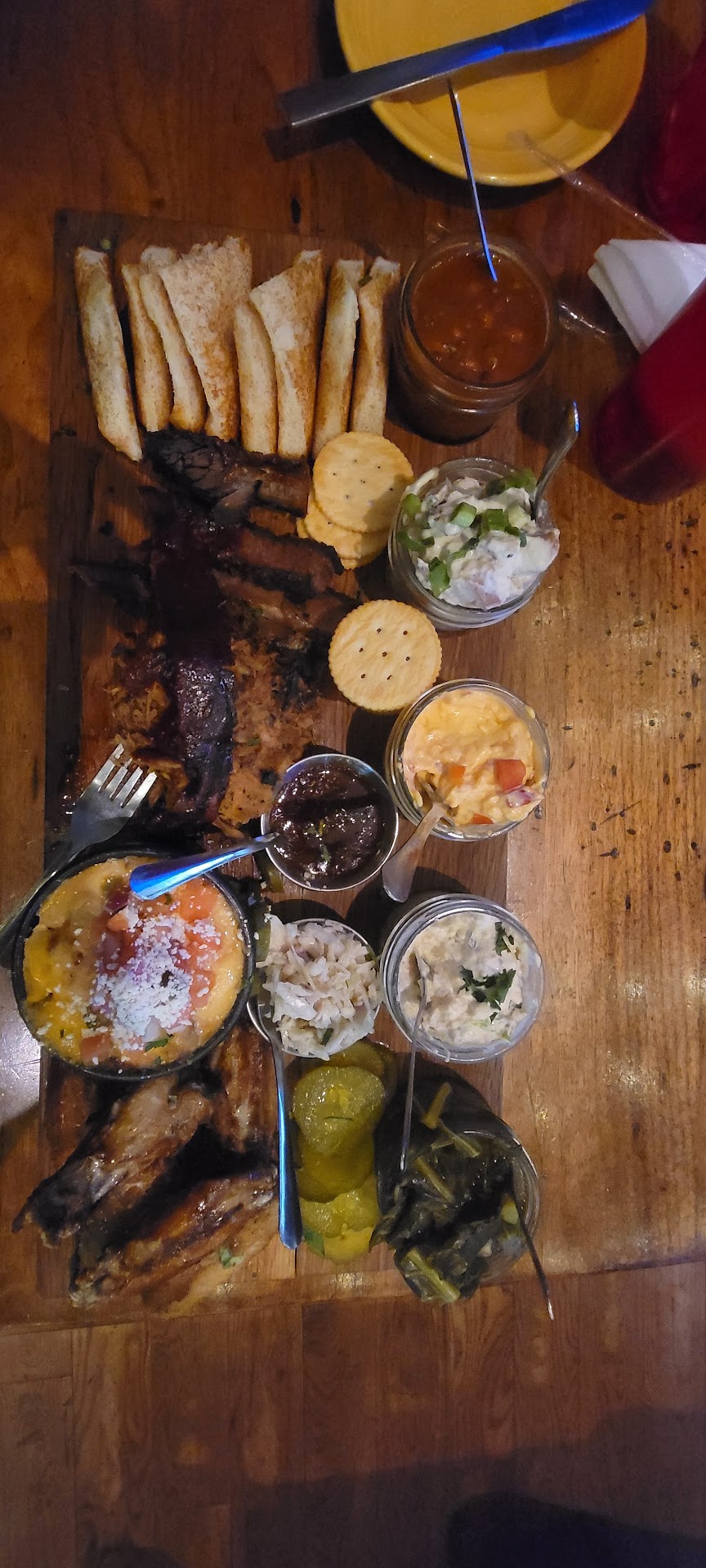 Didn't receive silverware and sodas were extremely flat. The atmosphere and restaurant was fine and clean. However, we ordered the Daddy Mac as it appeared to be the staple dish offering a variety of their menu. The brisket, pulled pork and burnt ends were good but nothing spectacular in comparison to other BBQ joints in NC. It was supposed to come with collard greens but for some reason, we didn't receive them. The smoked wings actually seemed to have been cooked with a lightly crisped skin and moist inside but the flavoring they put on was either forgot or used so spraringly that they tasted like plain chicken wings. They were served with a very sweet sauce that resembled honey and a berry sauce that I couldn't quite figure out. It's almost as if they tried too hard to fit a modern narrative of what hip modern food should taste like. The potato salad might as well have been a shot of liquid smoke. The pimento cheese was actually one of the best things on the board but wasn't served with enough Ritz crackers or toast to eat with the meal. The hash had the taste of an MRE that was pulled straight from the package and served. The Barbecue beans had a sweet tomato and whiskey taste which didn't exactly compliment anything on the plate. The slaw wasn't bad, a little vinegary but went well with the pork. There was another jar of something on the board and we were not told what it was (and it wasn't on the menu) but we assumed based on taste that it was some type of buffalo chicken dip. The candied bacon was actually the saving grace and it was saved until last to end the meal with a good taste in my mouth. As far as portions go, I have a healthy appetite and split the meal with my wife who eats like a bird and if the food were great, then I probably could have ate most of it myself. I will say that although I didn't enjoy it and probably won't go back, it did taste completely authentic and definitely not a...