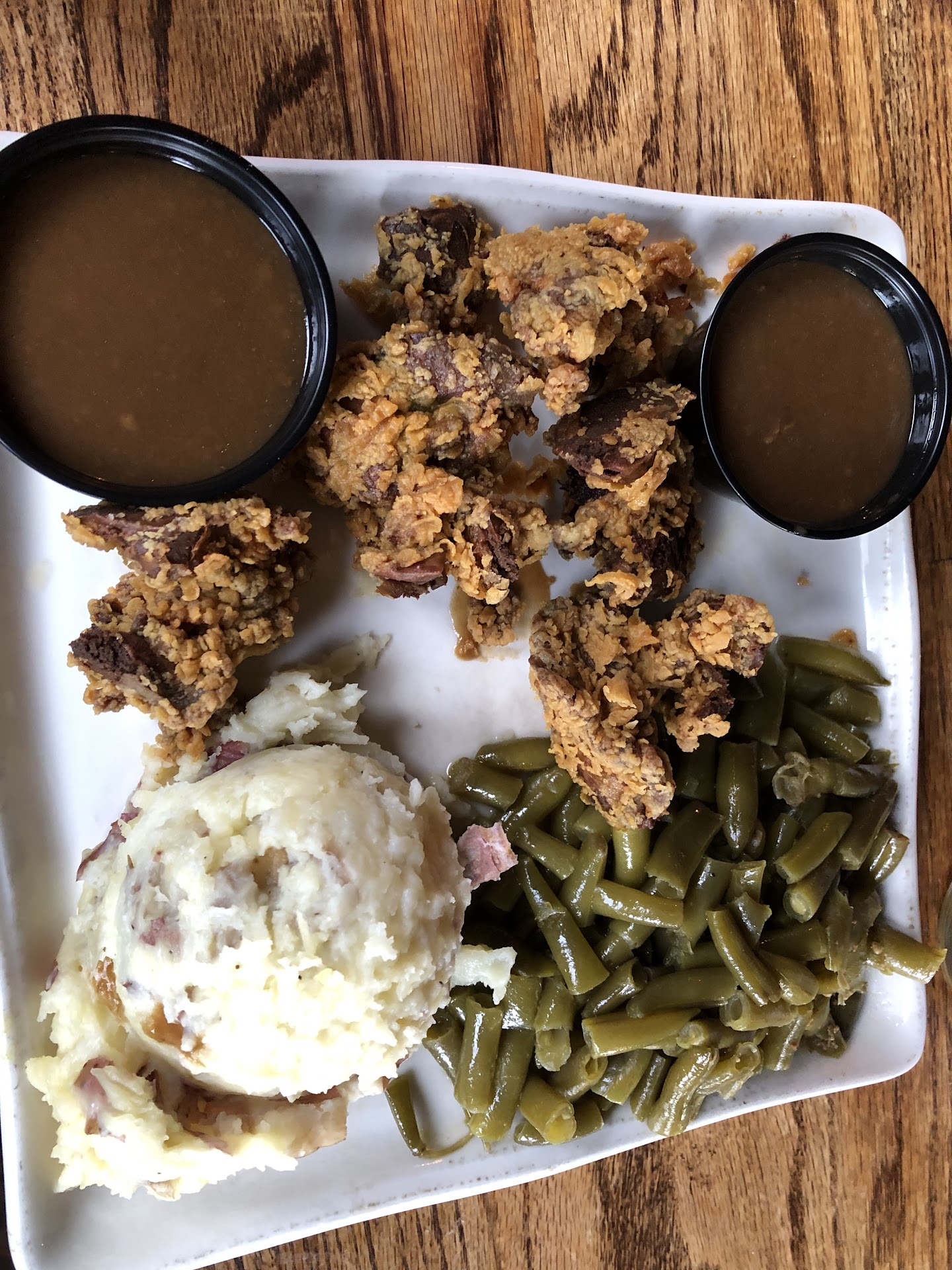 The staff is always friendly. I decided on a beer -- a Greek bottled beer ($4.50) called Mythos -- and the small Tiger sauce wings (6 for $10.25). The lager was good, the wings were good if you like'em big and messy. For my main I ordered the fried chicken livers with smashed potatoes and green beans (a bargain at $14) along with gravy. These aren't my favorite livers in the world, but they're not bad, the green beans were Southern-style (cooked for a long time) and the serving of potatoes was huge. The gravy was good. This was more than I could eat, so I took some home. My wife had the Reuben, which also was good, with a big side of fried onion rings. ($13 including an upcharge of $1 for the onion rings). Very good.