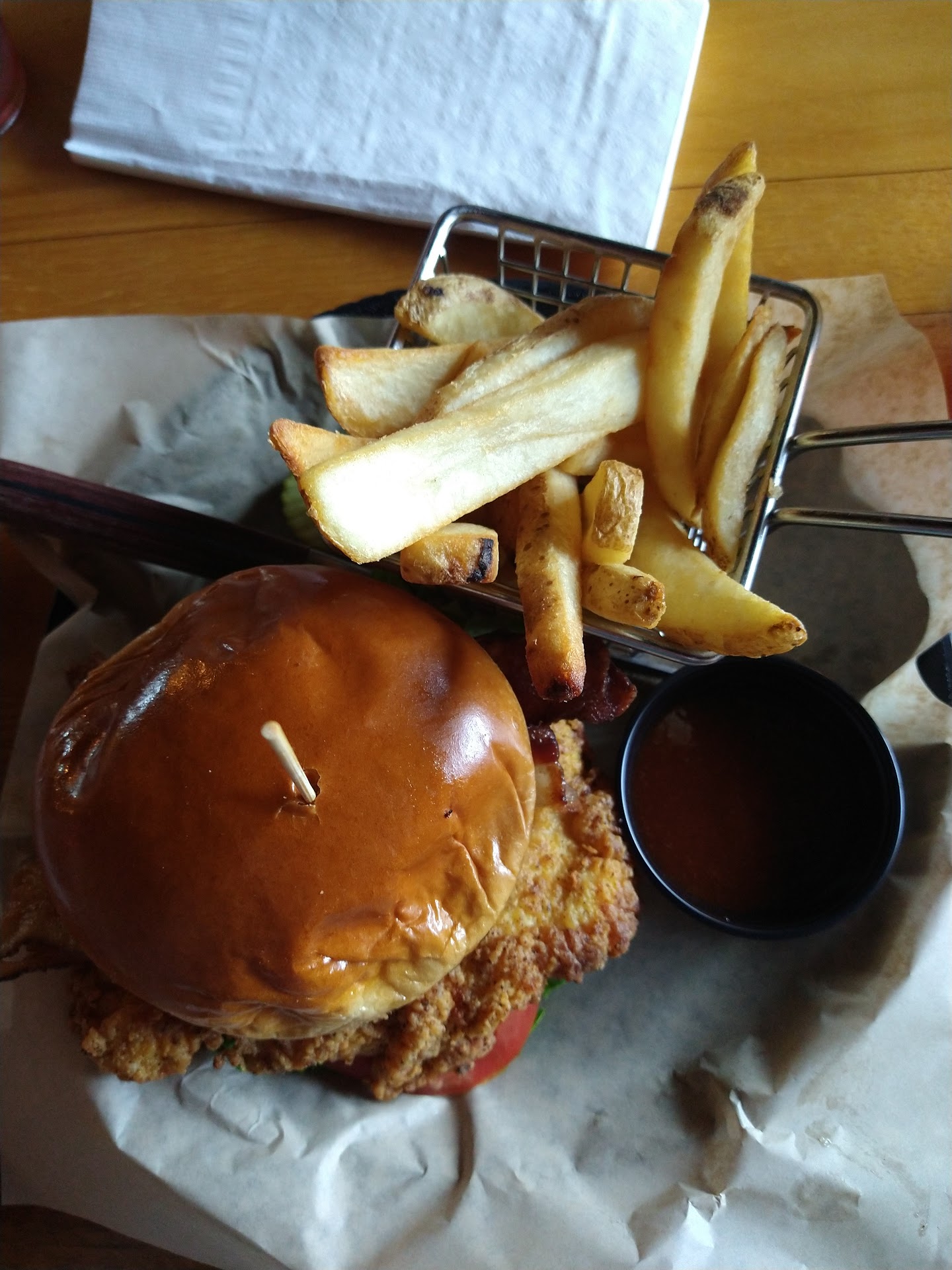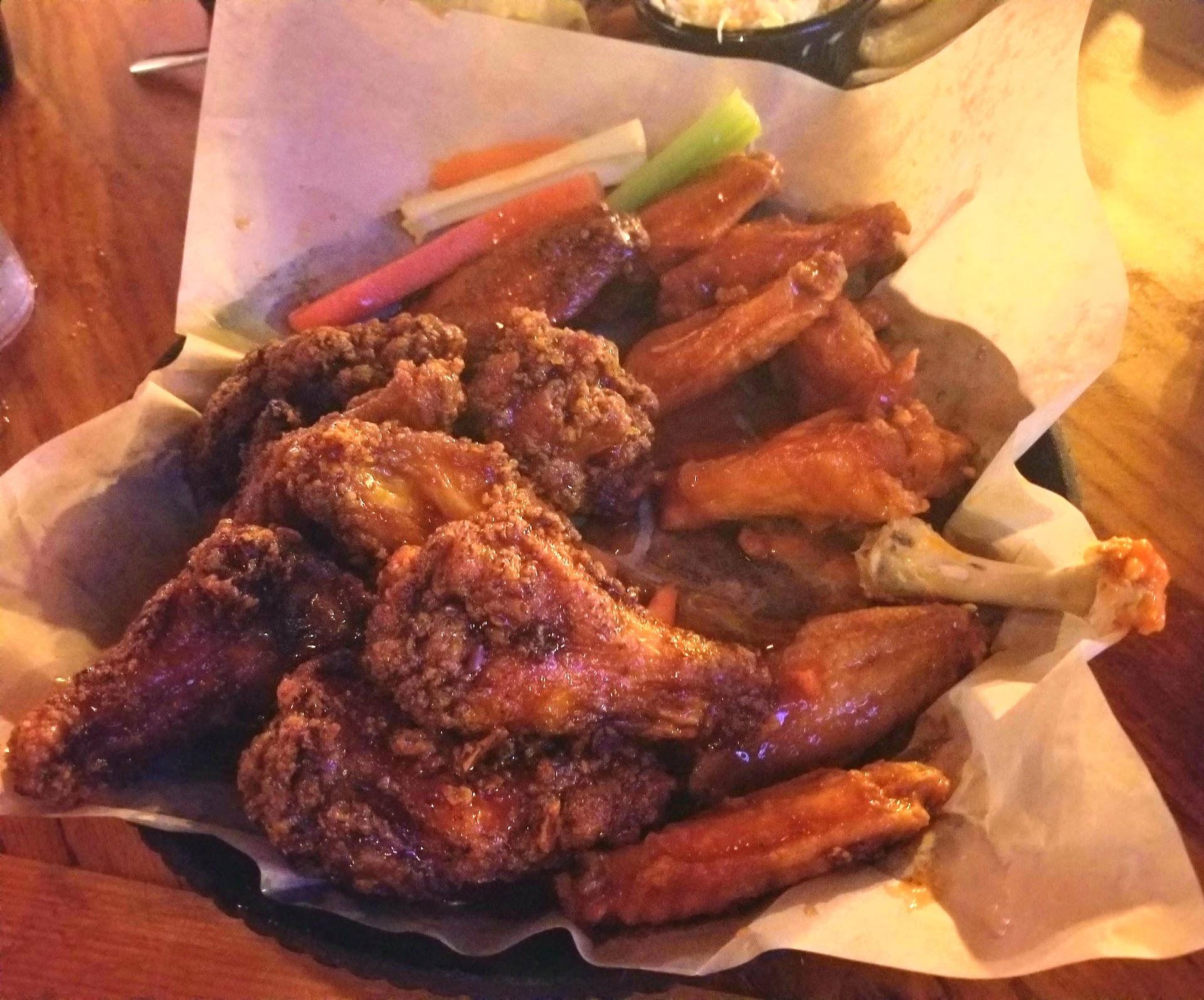 Yesterday, we got there early, so there was no parking issue (if you come at peak times, expect you'll have to park in the lot up the hill or farther away). We got to choose our own table and settled down to look through the menu. There is a big variety of things to order, from burgers and sandwiches, to wings of various sorts, to "signature plate" of things like steaks, fried chicken, chicken livers and such, plus beers and cocktails.