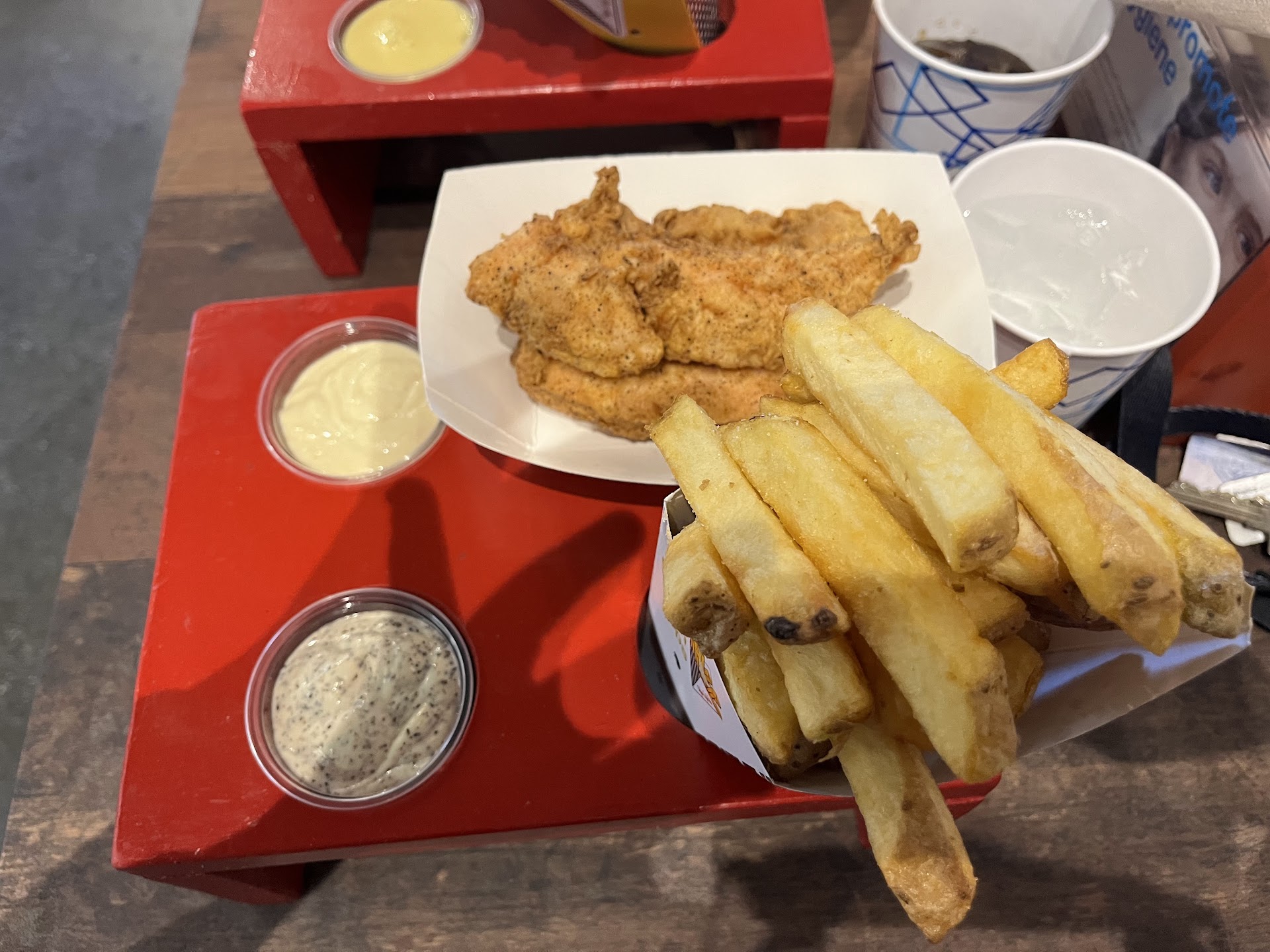 Read moreThis is the first time I had a chance to visit this new chipery in Asheville. The chips are thick cut twice fried so they are crunchy on the outside with a pillowy center, personally I think they were a bit on the dry side and prefer my chips with only the single fry but they were still very good and I feel most people will like them. The chicken is nice chicken strips dredged in a pepper flower mix. The chick stayed very juicy the flavor of the coating was very black pepper forward but still very good. When I came to the fish however I was extremely disappointed. The cod is coated in the same pepper flower breading that the chicken is so it is not a traditional wet batter at all. The lack of a batter lead the fish to be quite dry, over cooked and the pepper overpowered any flavor of the cod.