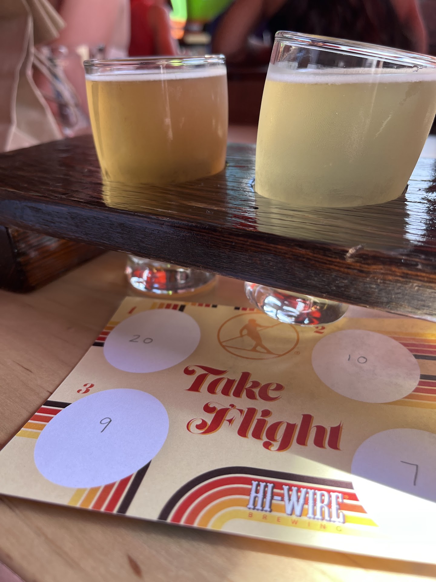 I had great experiences in all the breweries I had visited in Asheville so far during our stay so was disappointed to have that pattern broken with a poor one at Hi-Wire. I visited on 8/4 and unfortunately, they weren't offering flights, which I figured may be the case since it was a Saturday and they were likely to get busy. I was perfectly fine with this until they started serving flights to other people. When my boyfriend asked if we could do a flight, both bartenders were quite rude and dismissive with a chuckle and a "no" with no further explanation. When I tried to go ask the gentleman behind the bar why others were receiving flights and we could not, he at least tried to explain a little further - something about how he thought he was making only one flight for this group that turned into multiple flights and how long it had taken him to get this other group their flights when they were busy, yadda yadda. If the answer is no, I have no problem with that, but don't make exceptions for some and then be rude and dismissive to others who are also interested in whatever service you're very clearly providing to someone else. I would have stayed to try more beers because the two we tried were really good and I liked the option to purchase 4oz pours so we could try many, but after the very poor service, I closed our tab and we went somewhere with a much more welcoming staff (which was everywhere...