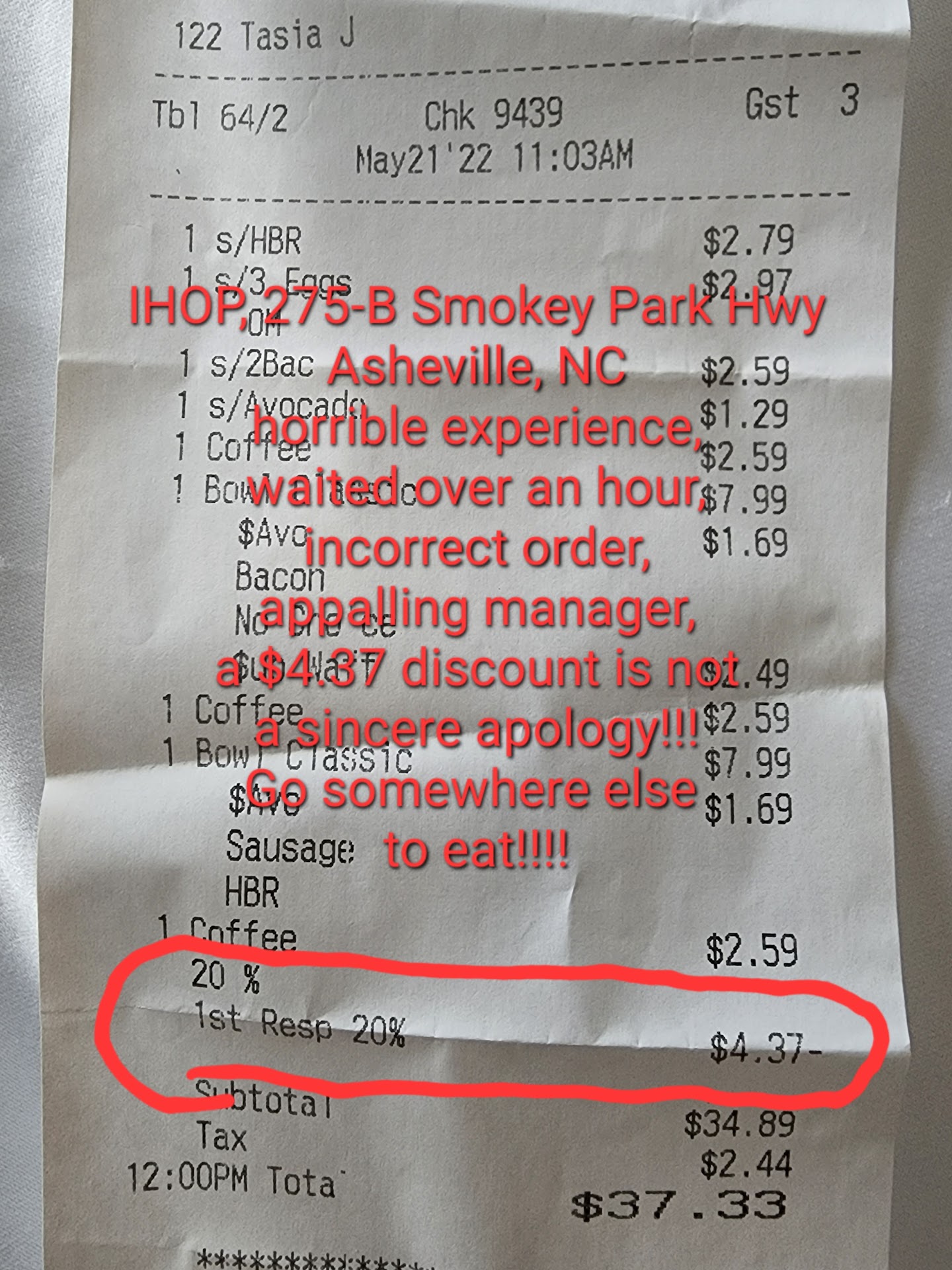 Don't go here (IHOP, 275-B Smokey Park Hwy, Asheville)!!!! 1 hr and 14 minutes and we were just being served food, breakfast!!! We waited for about 10 minutes to be seated ... no problem. But after the simple order was taken for 3 people, it was over an hour until the food came and it was wrong, incomplete and cold!!! This was not the worst part, the manager's response was horrific!