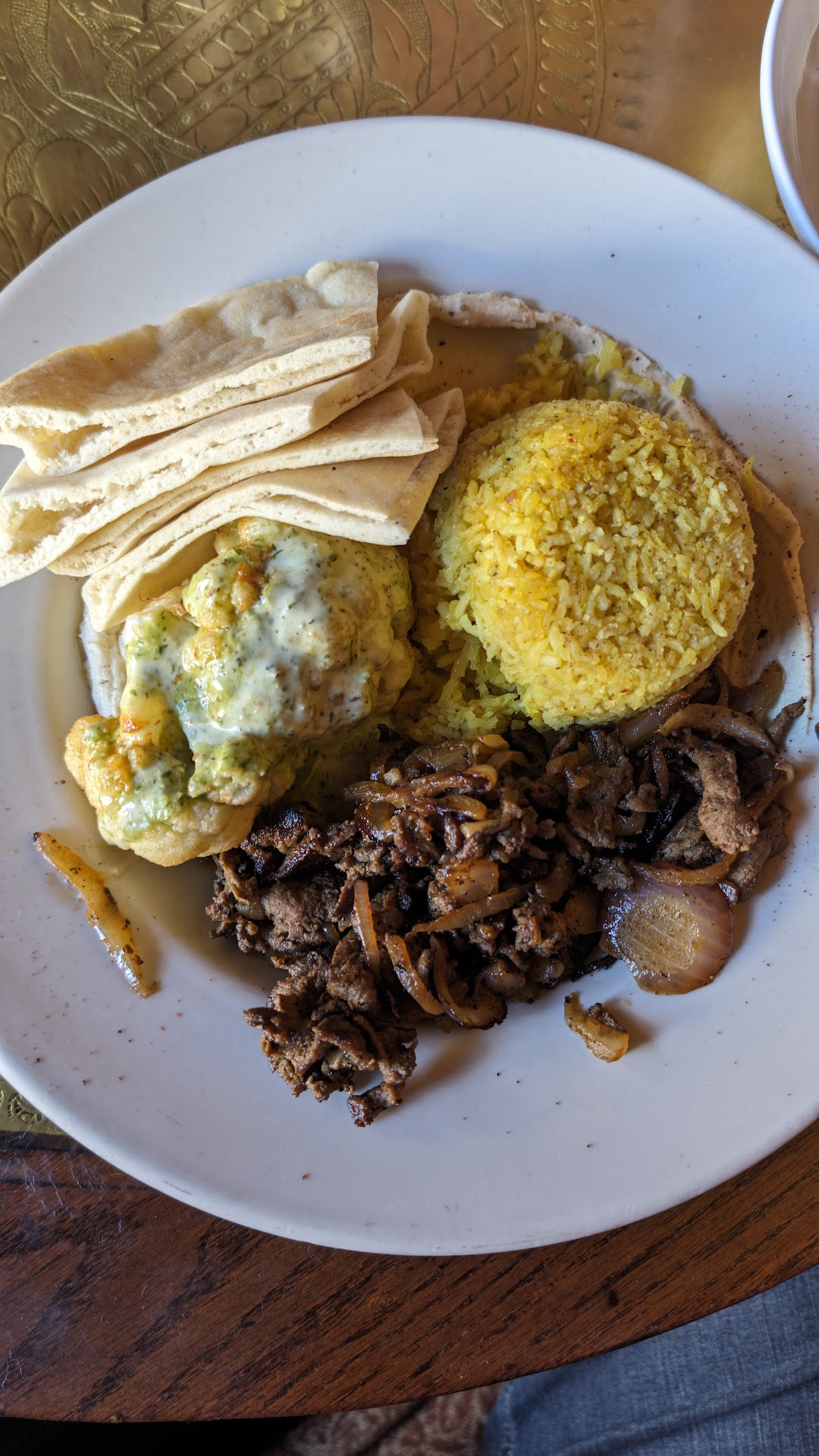 Our server (Asil) greeted us with waters and sold us on hibiscus teas, stating if we didn’t like them we could swap them out. We ordered pretty quickly after. We ordered cauliflower for an appetizer, falafel gyro (gluten free) with potatoes, lamb gyro (gluten free) with a side Greek salad, and a chicken kabob platter (no dietary restrictions). I expressed our gluten sensitivity to the server. She seemed to be understanding of what we needed. After that she never came back except to drop the dishes and I mean literally drop. Halfway off the table. No check back, no water refills, nothing. I realized upon trying my salad there were croutons, which I can’t have. We waited, waited and waited. The whole table finished everything (minus my salad) and still no sign of our server. It wasn’t until another server overheard me say “I guess our server forgot us?” that anyone checked back at all. She took the salad and went to correct it. We sat there a while longer and then our server finally came over. I explained the salad issue. She said “yeah the salad has croutons” like I was supposed to know that even after a full discussion about me being gluten sensitive. She eventually came back with the salad…dropping it as if I was wrong for having an issue. It was almost confrontational. I’m not sure how else to describe it. Everyone else at the table had long since finished their meals so I asked for a box. She stormed back over with 4 boxes. “I brought different sizes because I don’t know what you need.” Over the treatment from the server, who literally didn’t provide service throughout the entire meal, I got up and brought her my card. I asked “have I offended you in some way?” A nearby server promptly quipped “no one’s offended we’re just really busy” to which our server said “yeah I was just really nervous because your salad was taking so long.” I responded stating she never checked on us once…
