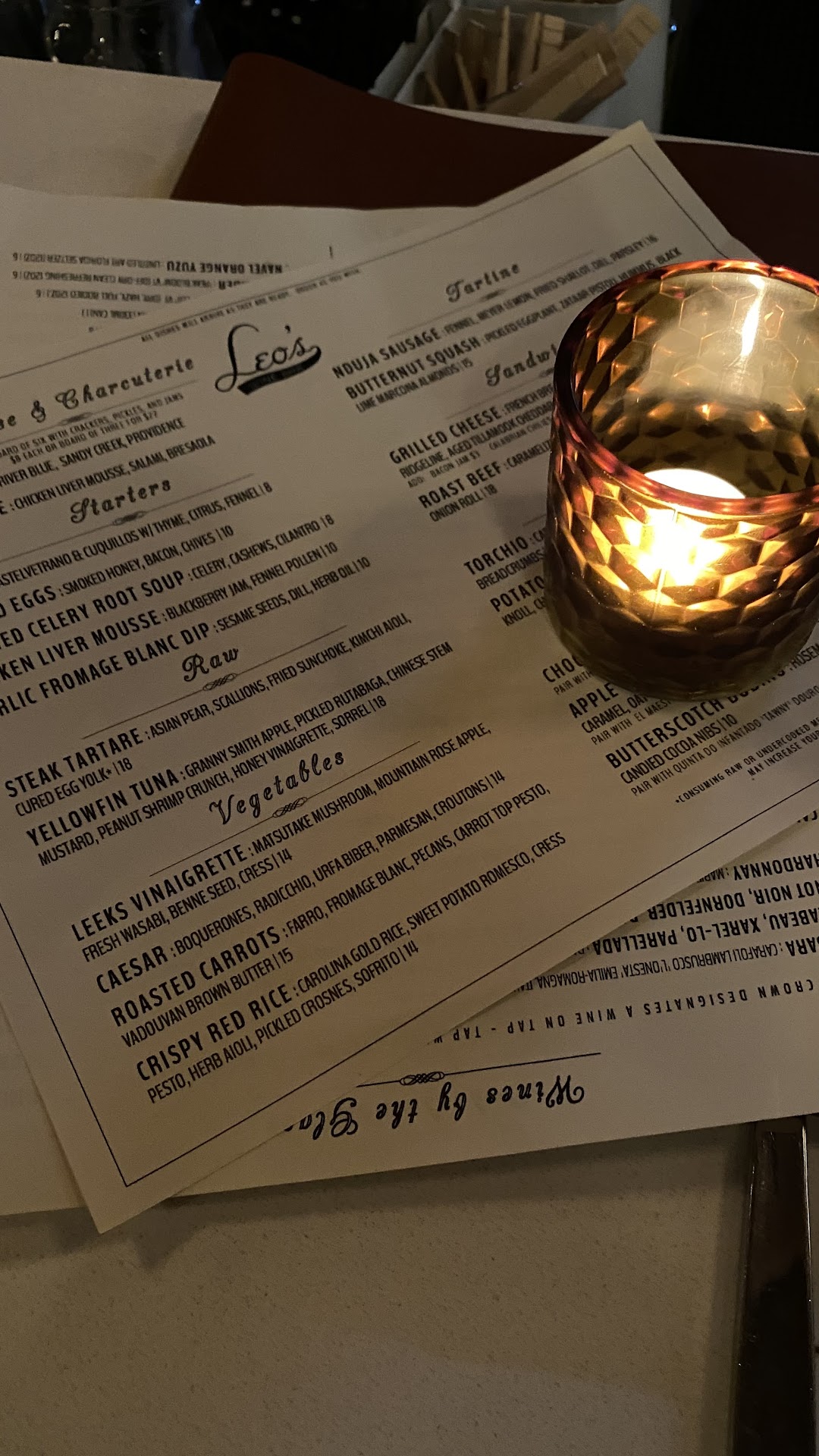 I saw a picture of the grilled cheese on Instagram a month or so ago, and have been dying to try Leo's ever since. It did not disappoint. We came in on a rainy Thursday afternoon, and the host allowed me to look at all the seating options before choosing where we wanted to sit. The back deck was lovely, but was full except for bar seats, and the picnic tables in the back were a little wet from the drizzle, so we chose an inside table, right up front. It's a cozy atmosphere, with tables placed fairly close together, but not so much that you felt crowded. The wine list was extensive, with lots of by the glass options. I chose two wines from their 'draft' list. I prefer my reds to be served at room temperature, rather than cool, but I just held the glass in my hands for a few minutes to warm them up before I drank them. Both wines were excellent for the price! My friend is not a wine drinker, but picked a beer from their list (not nearly as extensive as the wine list, but inclusive of a few standard beer styles), and enjoyed it. We shared the steak tartar and a grilled cheese, and both were delicious. The steak tartar was seasoned perfectly, and served with an egg yolk in the middle, just as it should be. The fried onion strings gave a little bit of crunch, and the thin crostini's were a perfect accompaniment. The grilled cheese was chock full of a great blend of cheeses that gave it a great flavor profile with lots of depth, and while I'm not sure I have ever said this before, my only complaint might have been that there was a little too much butter used in the grilling. I know... too much butter?? Is that possible? It certainly didn't stop me from finishing my half of the sandwich, but it did make it feel a little greasy when combined with all the cheese! The salad that was served with the grilled cheese was simple, but perfectly dressed with a simple vinaigrette that balanced the richness of the sandwich. I will definitely be back to try more of the menu items. There were quite a few other things I wanted to try, like the deviled eggs! Our service was attentive but not overbearing, and all the staff were friendly and welcoming. I loved that they folded the napkins on our neighbor's table when they stepped outside for a minute (see photo). It's those little touches that make all the difference! Thanks Leo's for a...