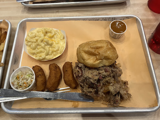 The interior has a tasteful modern rustic aesthetic. Instead of trying to replicate a completely authentic bbq joint feel in a modern space, it combines the best of both. There was a line of about 10 people to order, which is done at the counter. It moved fairly quickly even though the lone cashier was helpful and patient in explaining the menu to us patrons.