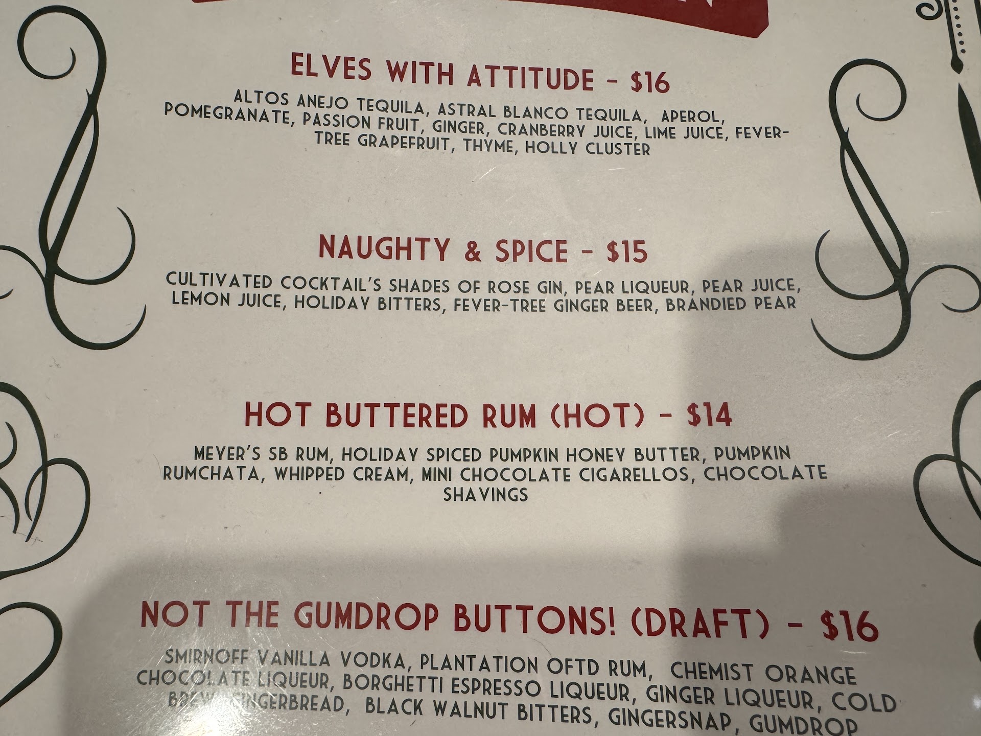 However, they had it decorated pretty festively for Christmas, and again, the cocktail specials were on point! I had a hot buttered rum, and it was beautifully presented. Our server was pleasant. My husband had a Belvedere martini dirty with olives. I also had an “elves with attitude” which was tequila based, and really well balanced! It was served with enough rosemary that the drink almost fell over! Super festive. Almost a baby Christmas tree in my drink.