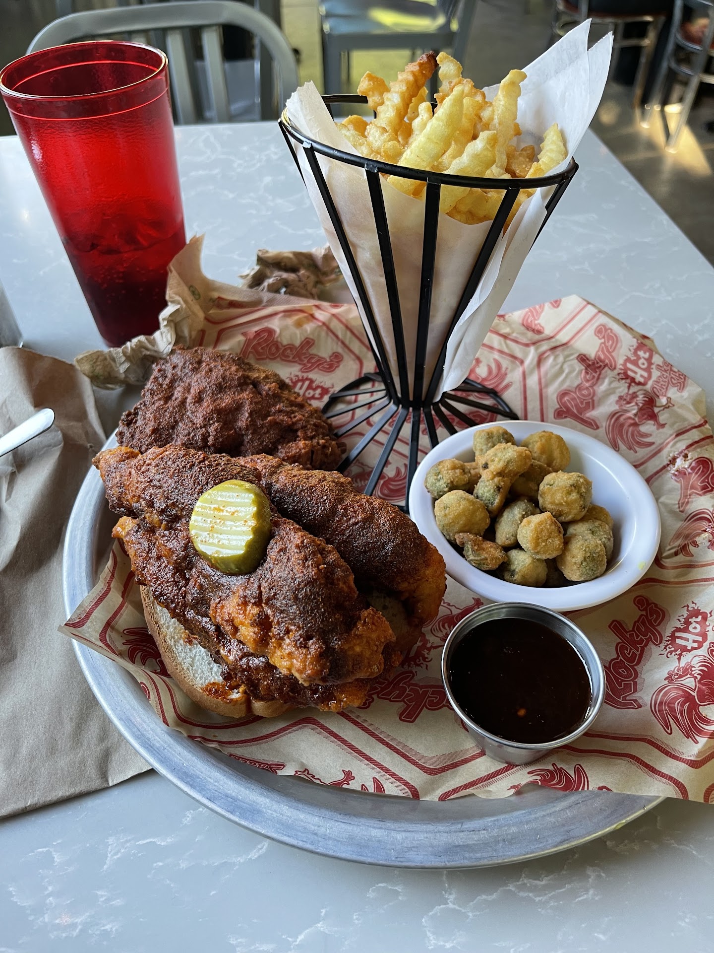 Chicken tenders were very juicy had a really good amount of Rockys Sauce on top of them. As far as spicyness I give it a 7/10. It's hot enough to make your nose run, but doesn't dish out punishment for choosing that spice level. If you're more spice sensitive, select a lower heat level and enjoy the flavor. Tenders overall 7/10 Chicken thigh was really juicy and had more sauce than the tenders. It seemed to penetrate further into the meat as well. 8/10 Fries were crinkle cut obviously and had a good blend of crispy but not overcooked. 8/10 Okra was fried perfectly and reminds me of south Louisiana 10/10 Coke Cake was a little dry but still tasty. Very chocolatey and the icing on top reminds me of fudge. 6/10