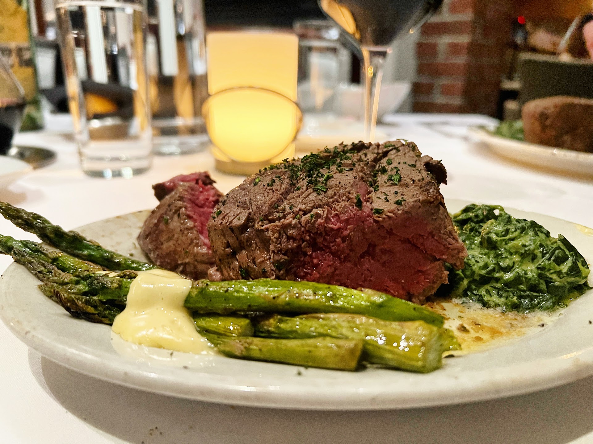 We ordered vegetable sides that we share. The Grilled Asparagus with a serving of Hollandaise Sauce was delicious. The asparagus was grilled to a perfect tender-crisp. We also ordered Ruthâs Chris famous, classic creamed spinach that is always luxuriously silky and flavorful. It is our favorite vegetable dish of all.