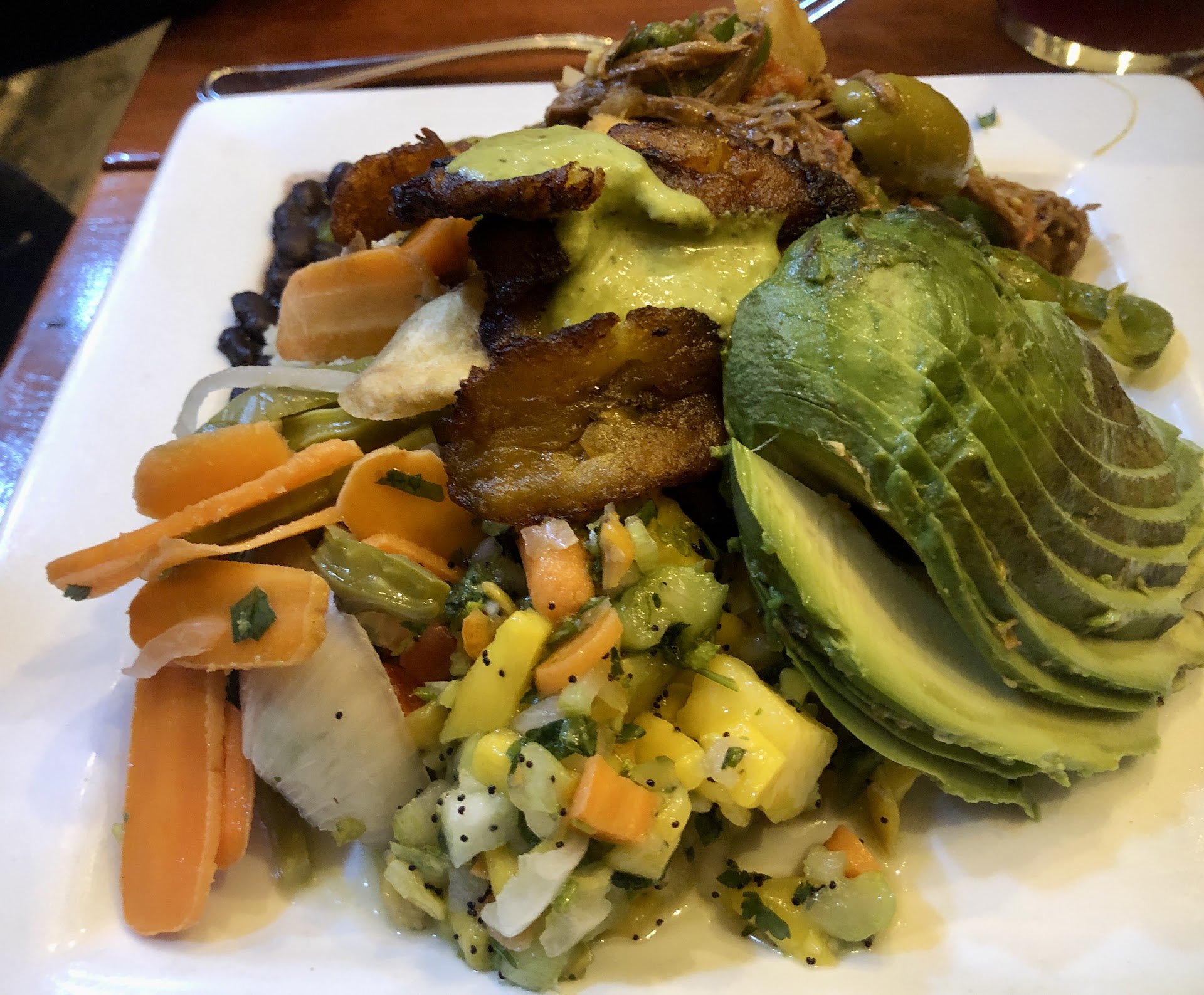 The food is always beautifully presented. My husband had the Ropa Vieja and I had the African jerk tuna special. The tuna was a tad bit overcooked, although they said it was seared. The first bites were specially overcooked, as they were the outside edges. But there was quite a bit more pink once I broke into the interior of the dish. Like many of the dishes, it was served with rice and beans and chimichurri and plantains.