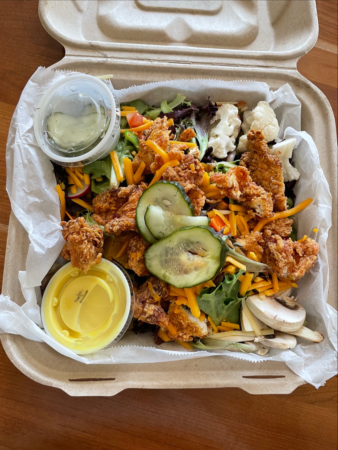 Did I order incorrectly? Yes. Did this in any way ruin my review? Not at all. These folks are known for their fried chicken sandwiches. I don’t love a fried chicken sandwich, I’d rather just have the fried chicken. Knowing this, I got the kitchen sink salad with fried chicken. This isn’t virtue signaling, I ordered cake, too.