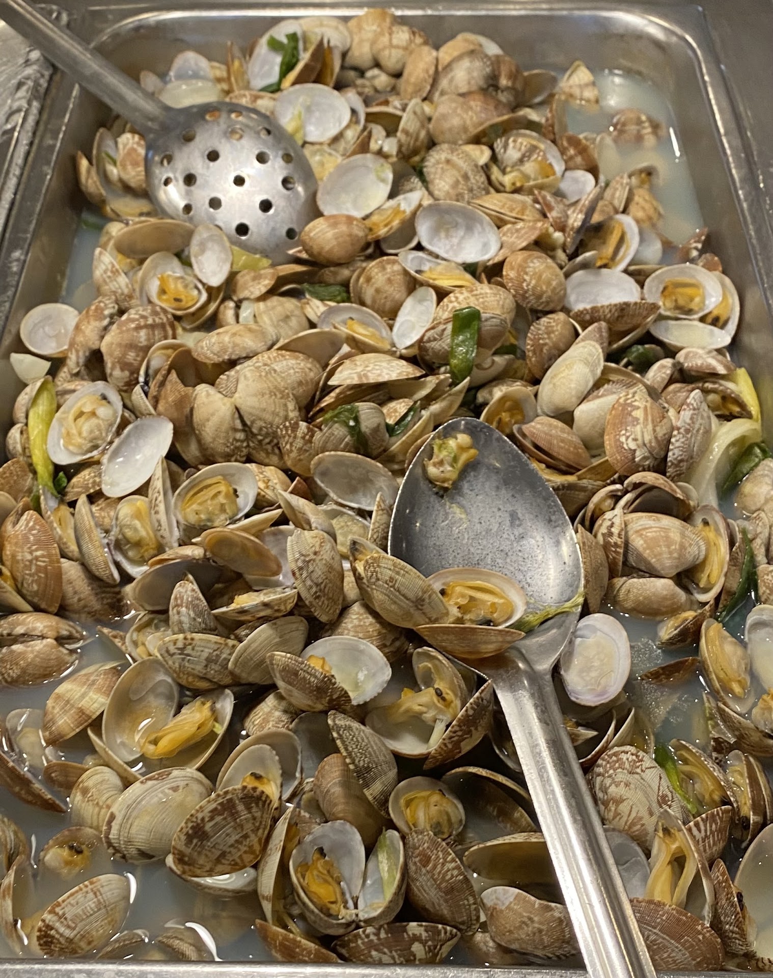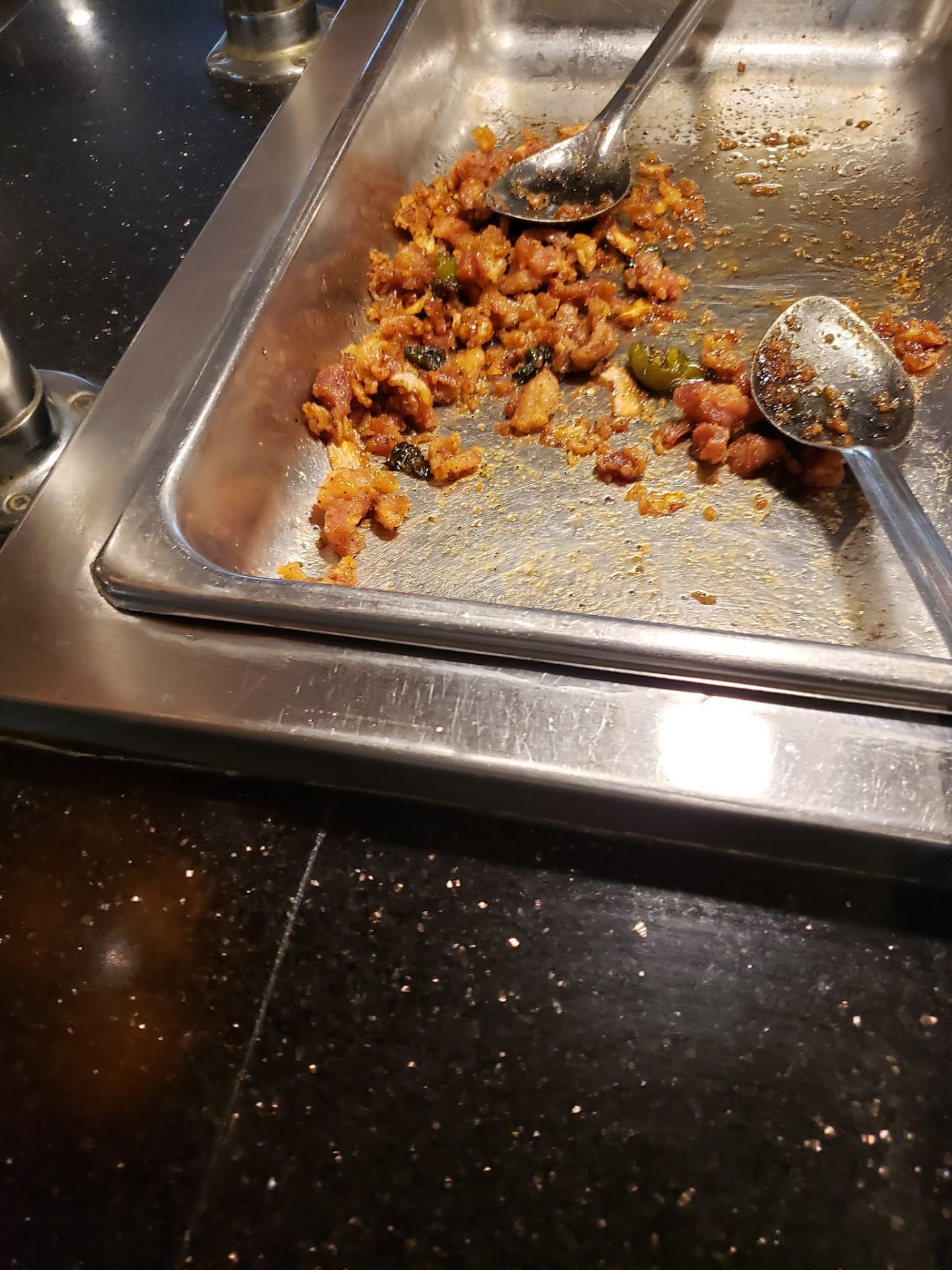 Ice cream Station; there was a scoop sitting in disgusting murky water on a dirty freezer cart. The ice cream was inside deep barells, all used up near the bottom. And frozen so hard, i could barely get any. I wanted something sweet - so tried anyway. Mostly, because they took the fruit away and broke down the buffet early. It was my only option.