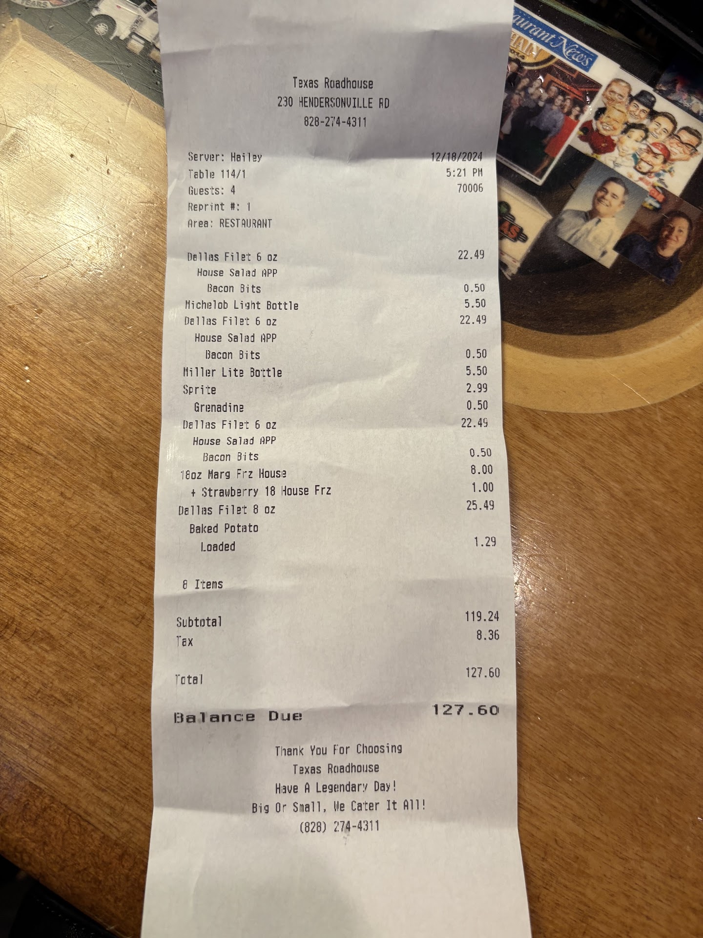 Wife writing from shared Google account: Hubby & I went out for our Valentines Day celebration early Sun instead, to avoid the busiest times. There wasnât even a wait yet when we got there which was super nice. Texas Road House has always been a fav of ours. Good steaks and good rolls. We usually bring fam & come for most of our celebrations, but this time it was just hubby & I. Rolls came out & were hard as a rock. No biggie. Looked like they werenât proofed enough. You could tell b/c they were also small. Asked for an another basket & it was similar. Oh well. The rest should be fine. Hubby ordered 11oz sirloin rare w/loaded baked pot & salad & I got a 12oz ribeye medium w/loaded sw pot & salad. Food came out quite a bit later & you could tell it was overcooked before even cutting. Hubbys was almost medium. Mine was well done. And this was cutting in the center. It wasnât our server who dropped it off & the lady who did was already gone before we knew. Hubby said he would power through, not wanting to send 2 steaks back, but we sent mine back b/c it was way off. It took 5-10 min waiting for our server before we finally reached out to a bus boy to locate our server. Thatâs when things started changing with even our treatment. Our server came to the table & asked how everything was & I pointed to where I had cut the center of the steak & we let him know it was well done, & asked if we could we switch it out. The server checked his book & verified that yes he did put me down for a medium, & then he took it & walked away. No apology or empathy or anything. Not even a smile or frown or anything. About 10 min later a female manager came by & asked how we were doing & I told her what had happened & she said OK, she would go make sure it came out soon. In the meantime, our server came by to top off our drinks & he didnât even look at us or speak to us. Both of us said, thank you at our correlating times while he poured & he didnât respond at all. He just walked away. That was very uncomfortable. We had been warm & understanding & chill, & now we were being shunned by our server? About 15 min after the steak had been sent back, & about an hr after we had gotten there, the manager brought it out to the table. She did not include a fresh side. By that point, my husbandâs overcooked steak was now cold, as well as both our sides. Even though I have never seen him use steak sauce on a steak the entire time weâve been together, for 14 years, he had tried to use 57 sauce just to make it edible. So at that point, with our sides cold, & the new steak obviously overcooked as well (it was flat & dark & dry even on the plate) we just asked her if she could use the steak elsewhere before she sat it down & if we could just go. We explained that everything was cold now & his steak was not good either & our server was ignoring us & it was really uncomfortable so we rather just go. She said she would only discount our food. She was very cold & lacking empathy. Discount?! We hadnât even eaten it. We spent likely 50 min waiting for my entree I had ordered. And itâs not exactly fun to watch one person at your table try to eat slowly while they wait on your food to come out only for their food to be cold when yours comes out. If he wouldâve eaten while it was warm, I guess we wouldâve taken turns watching each other eat. She even made sure I was charged for the 3 marshmellows that were on my cold sweet potato that was now sitting congealed on the table. My hubby & I met each other in the restaurant industry & worked in it for many years. This is not how you treat customers. Even though we got there early & left w/empty stomachs, by the time we went through all that waiting & disappointment & finally left, everywhere else in town was closed. It seems everywhere closes early since COVID & we live almost in Brevard, about 34 minutes from TRH. What an awful experience. We wonât go back. We wasted our money & time for nothing other than being treated like crap for our Valentine celebration. We do NOT recommend this...