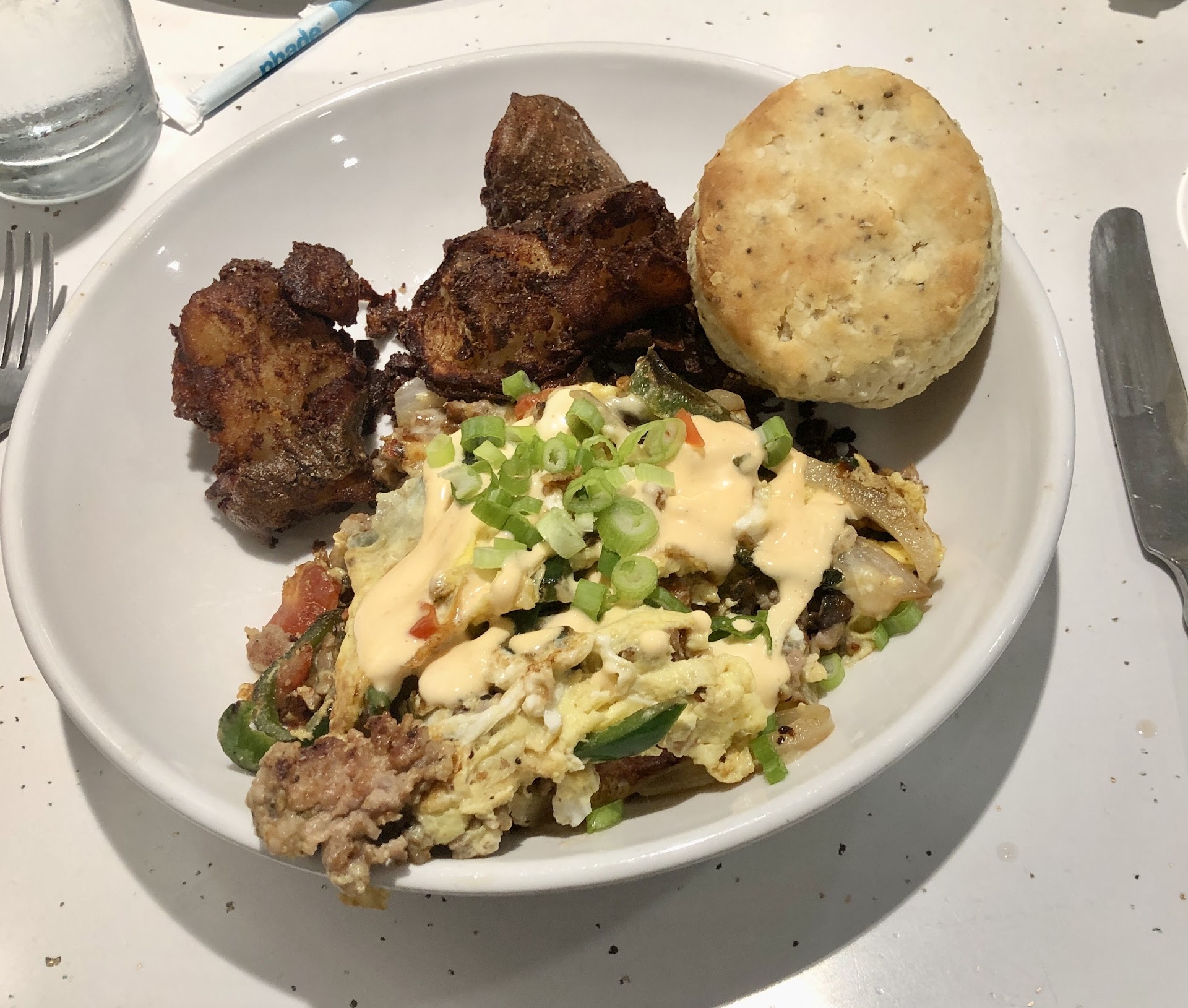 Husband ordered the royale with potatoes and a biscuit; my son ordered the chicken Gyro, and I ordered the hash bowl with a sunny side up egg. Both my dish and my husband’s dish came with potatoes. My hash was made with their homemade sausage, which was excellent. My son said his gyro was good, and it looked large and tasty.
