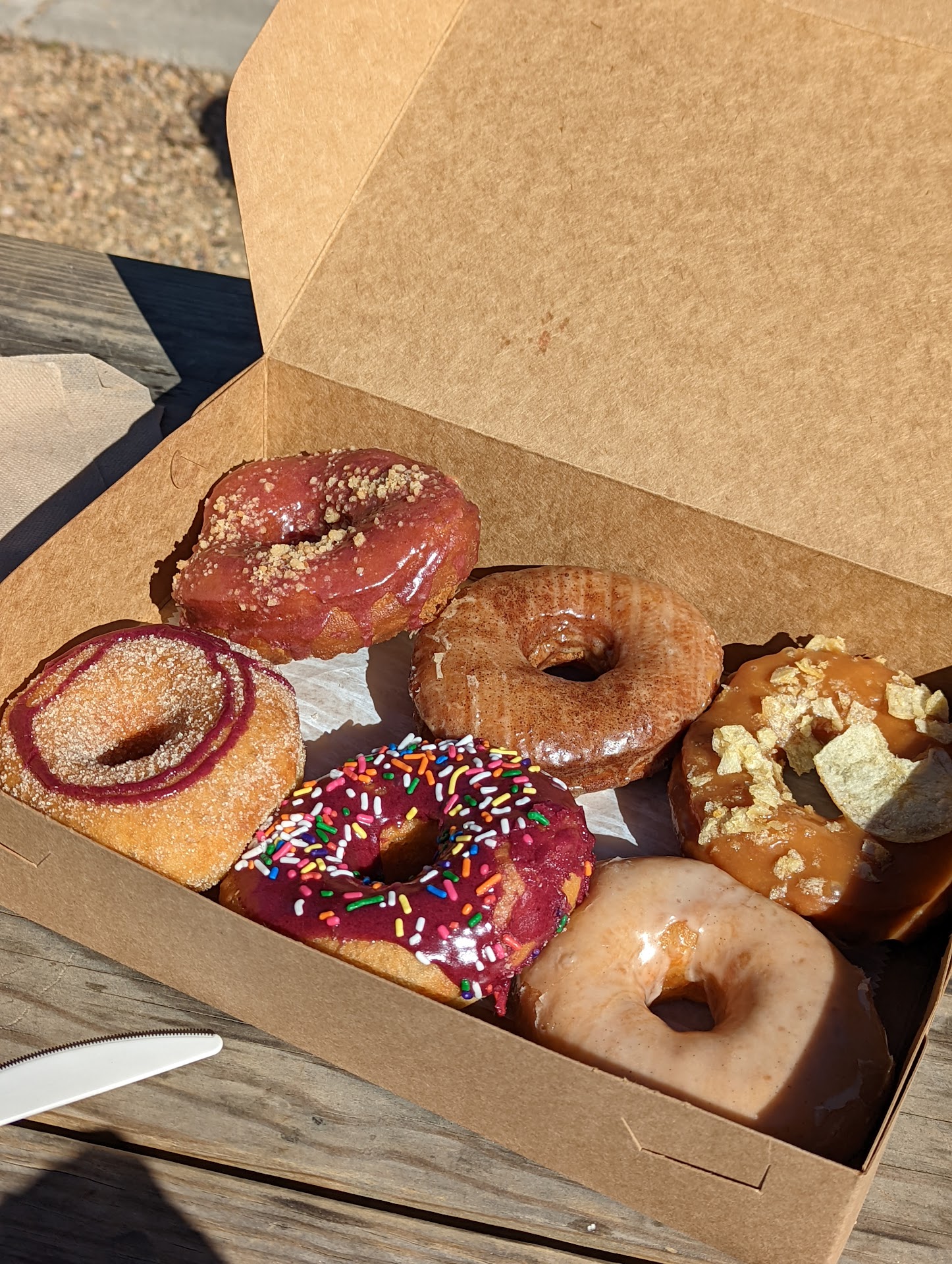 The flavors seem to be mirrored, so if you prefer yeast, you can get the same toppings as the cake or gluten free. We got the caramel potato chip, cherry vanilla cookie, espresso, blueberry sprinkle, glazed, and question marks (I forget).