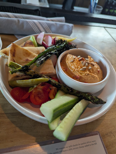Read moreStopped in for a drink and dinner. Service at the bar was great. Everyone seemed super friendly. We had the hummus plate and it was probably the best one I've had. The veggies were great and the hummus was fantastic. I can't drink at the moment so I asked for non alcoholic options. They didn't have a ton to choose from. I was kind of surprised as many places in Asheville do, but it is a brewery so I didn't knock them for it. Sat at a table for dinner. Got the burger and the strawberry salad. I was not impressed at all with the burger. It could have had a bit more life. It looked like something I could get at any chain restaurant and was lacking depth. I was expecting more from here after the beautiful presentation of the hummus plate, but maybe I shouldn't have had high expectations for a brewery. The salad was ok. I think if the dressing were a tiny bit more tart it would have been fantastic. The service wasn't great at the table. We had to go get our own drinks as they sat at the bar forever. I asked for a tea, had to ask twice to actually get it. Then she asked if I wanted a refill. That never came. The facility is great. Beautiful all around. There are oddly very few bathrooms and being in a wheelchair on this visit, they were a bit hard to navigate. Two stalls in the one upstairs. I asked if there was another. Apparently there is one downstairs but it is only one stall. For such a large restaurant I'm surprised they only have three toilets. I gave them four stars because the bar experience was so great. I probably will not eat a full meal here again but I'd definitely stop by again for a pint and...