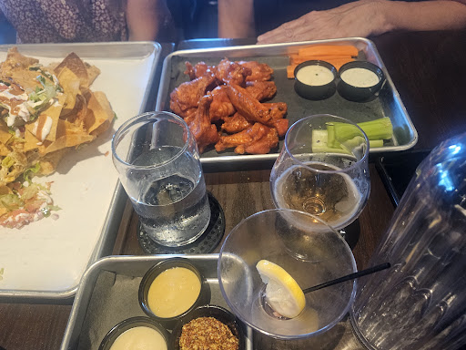 Maybe 20 minutes for food. Not bad. We ordered the wings, salmon sliders with a side of their onion( can't remember the name), nachos and their pretzel bites.