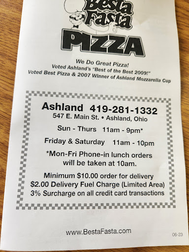 Read moreSo ordered 2 - 2 topping Lg pizzas and picked them up with a 2 liter 30 min later as told by them. Got them home and my family started eating first pizza and the grease was pouring off this thing! It was the most disgusting pizza we had ever eaten! The crust was burnt and the heartburn that followed ruined our night. Our kids normally love pizza and we never even made it past the first one which for our family is almost unheard of! We have had Besta Fasta in columbus ohio many times it was always pretty good. The to girls at the pizza shop were decent but the food quality was awful would not recommend at all. We will be going to Donna D's from now on it may be pricier but u get...