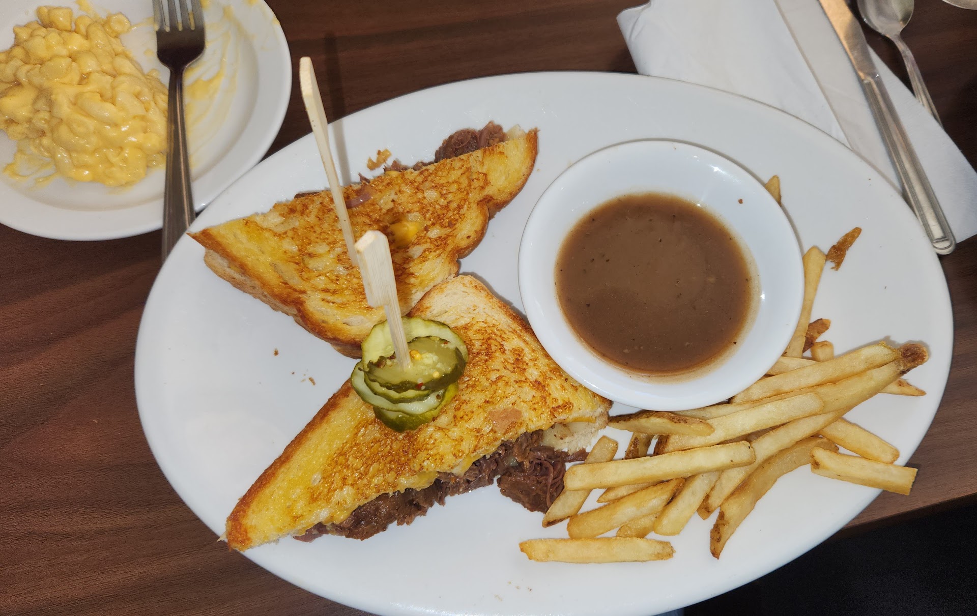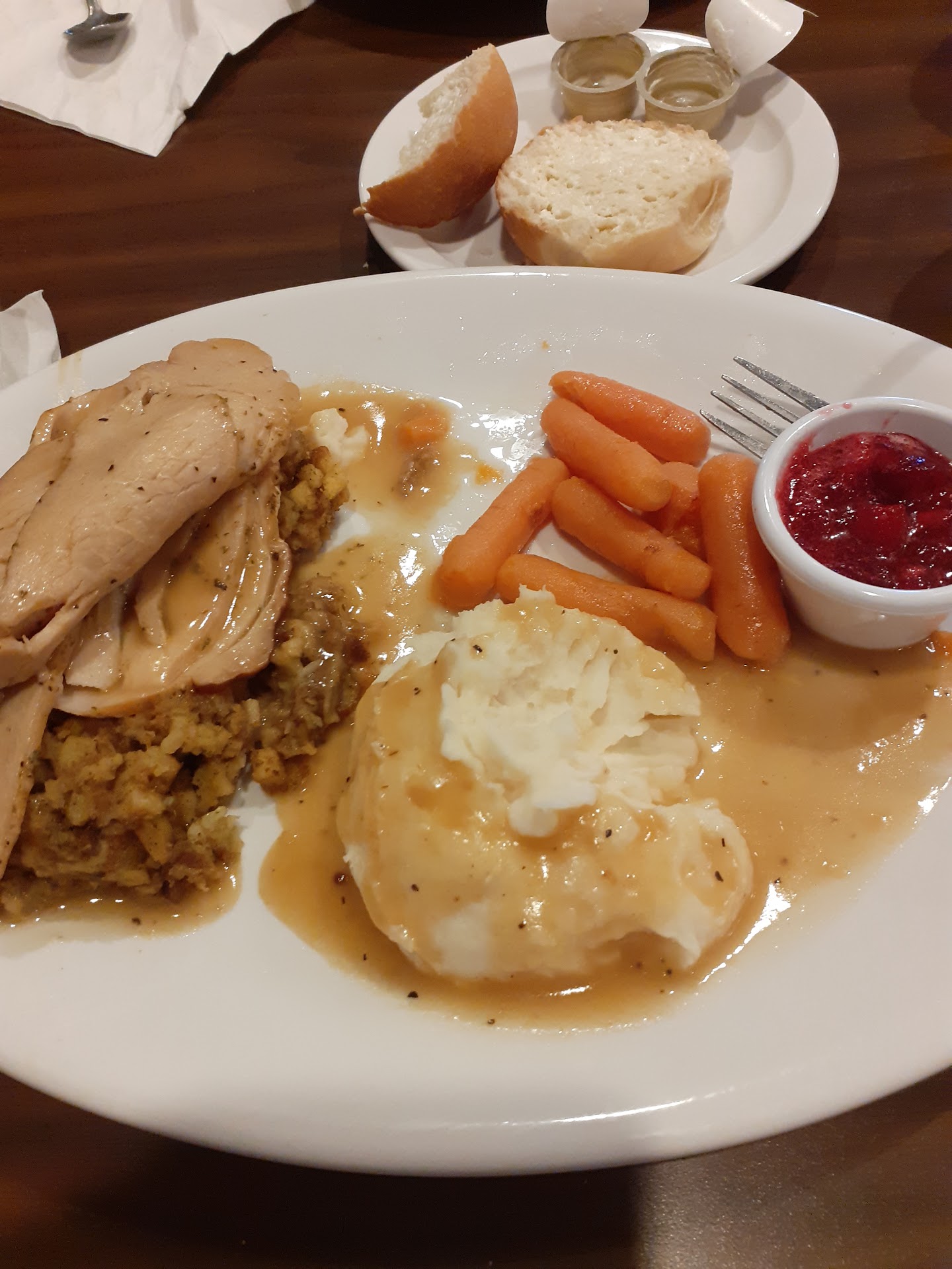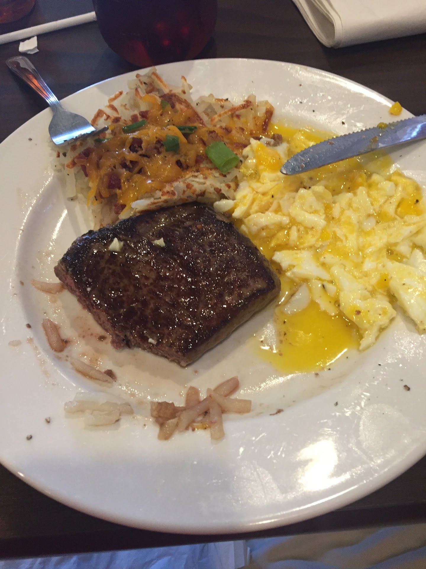 Read moreWere it not for the service, the score would be much lower. Our waitress was very attentive and professional. The few people who there dining as well she clearly knew as regulars and took care of quite efficiently. We never had to flag her down or ask for refills as she seemed to know what we wanted before we did! If only everything else was up to the same standard. Walking in me and my partner both noticed a weird smell in the air. It was very off-putting, but we were so hungry and in a small time crunch. Most of the issues were not noticable at first, it was after we had ordered that we realized our mistake. The ceiling tiles had water damage (probably the source of the smell), most of the tables were waiting to be cleaned (our waitress was the only one we saw in the dining room the whole time and had her hands full with serving us and the other tables), food was not up to par with what I have seen/tasted at other locations, and the restrooms were not the cleanest. All in all most of the issues stemmed from the building itself, NOT the workers. The whole place gave off a "run down" atmosphere that did not make for a comfortable dining experience. I do not think we will return to that...