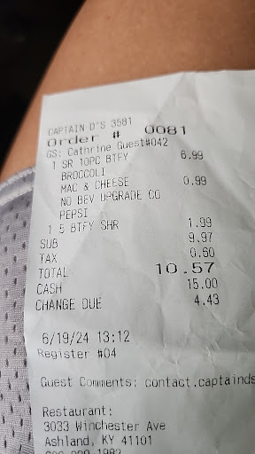 We stopped at Captains D's in Ashland Kentucky around 11 this morning Nov. 21.2017 and ordered takeout which we have never had a problem with. My husband had the catfish and I had the two piece fish and shrimp. We ate as soon as we returned home which is is Louisa Ky. but this time and this is the first time we both said what a lousy meal the worst we ever had there. His catfish were so small I gave him most of my shrimp the hush puppy had no flavor what so ever and I usually love them it was like a flour ball cooked., my fish was good the shrimp was good and the cole slaw was good. The french fries tasted like left overs from yesterday. We did get Shrimp cocktail sauce but with a takeout you usually get plastic spoons and forks and napkins. Nope we did not. It will probably be a while a long while before we go back...