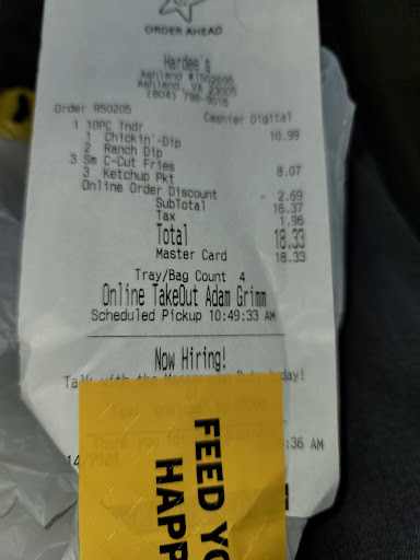 Read moreMy family and I just stopped here on our way down south. There is no Hardee's where we live, so whenever we make road trips, we like to stop at Hardee's. We were so looking forward to our meal, but after waiting 30 minutes (when there were only 3 other customers in the whole place), our food was cold and mushy. My 1/4 lb burger was SLOPPY. It was slathered in mayonnaise so heavy it was seeping out all over the place, the patty didn't even seem cooked all the way and it was cold, the tomatoes were mush, and the lettuce (the little that there was) was wilted. My kids' burgers (3 of them) and my husband's were the same. MUSHY and SLOPPY. My husband's Frisco burger wasn't even toasted. The fries were cold and tasted like old grease. If we hadn't gotten takeout and been anxious to get back on the road, after having spent an exorbitant amount of time there to begin with, I would've gone back in and asked for my money back. I wish I would've taken a picture of it before starting to eat it so you could see how nasty and unappetizing it was. It will be a long time before I'm ready to eat at...