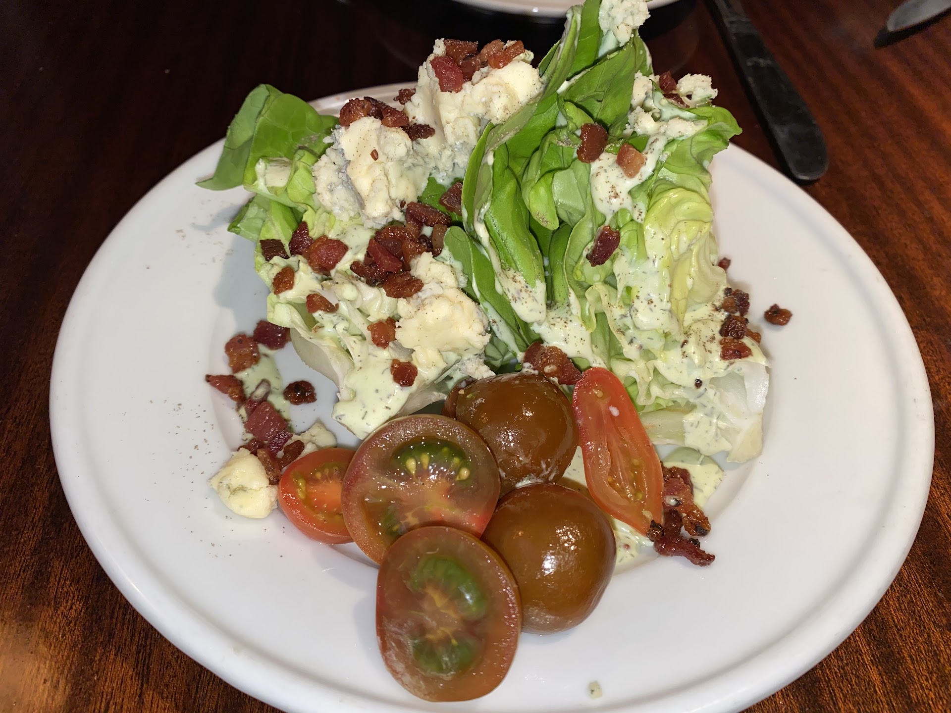 We also shared a small butter lettuce wedge salad. It was also delicious and beautiful. The bacon and heirloom tomatoes and house dressing with Rogue Creamery blue cheese was a perfect bite with the butter lettuce. My boyfriend got the tenderloin with mashed potatoes and collard greens. He shared a bite of the steak and the potatoes. It was excellent and perfectly cooked. I got the grilled shrimp with roasted poblano and jalapeño peppers and cheese grits. I had cornmeal crusted fried okra. It wasn’t awful, but I didn’t love it either. That was my first try at this southern item. The grits were so creamy and delicious. The shrimp was beautiful and delicious, a bit over cooked, but very tasty anyway.