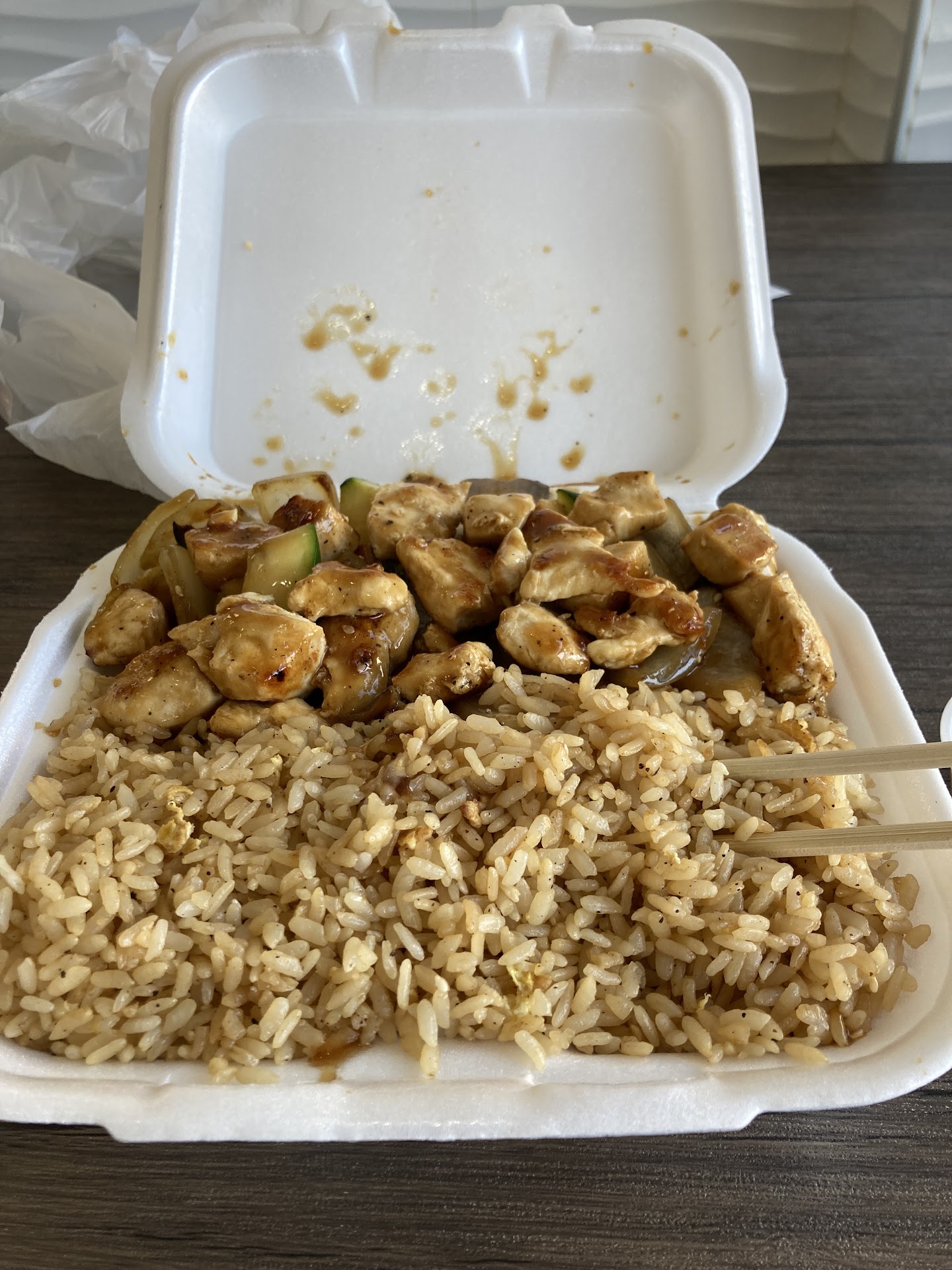 I had the Hibachi Chicken for lunch and it was as good or better as any I have eaten. There was enough to share, or in my case to take to the hotel for another meal. In the picture, yummy veggies are hiding under the chicken. Friendly service from the manager (perhaps owner). You order at the counter and they yell out your name to pick it up (welcome to a small, southern town!). Dine in is very informal (chose a table, grab your drink and utensils, have a seat) or you can carry out. This is directly behind the Delta hotel so don't miss having a meal here while at the hotel (lots lots better than the hotel restaurant, which I only recommend...