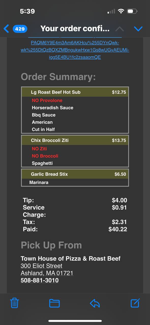Read moreOrdered a hot roast beef sandwich and when I got home I discovered that it was never heated. Called to complain about the order and the person who answered the phone decided to argue with me claiming that I didn't order it correctly and that I needed to ask for it toasted if I wanted it hot. I pointed out that the order clearly says "Lg Roast Beef Hot Sub". At first, she refused to refund my money until I threatened to chargeback the entire order.