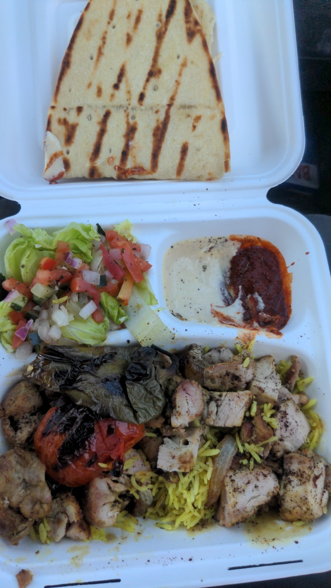 Beautiful resturant with open kitchen and sundries for sale. Ordered the F-Bomb and the Lamb and Chicken platter. The F-Bomb is advertised as having extra meat and falafel balls. If this is extra meat I would not order the standard meat gyros. I prefer Naan to the tortilla like wrap they use for their gyros. Mine had 1/2 salad inside but it did taste excellent. I think I found one falafel ball? There taziki sauce is thick and rich and on point. Their spicy sauce is OK, I would get it on the side so you can control your flavors. The lamb and chicken platter was excellent. It might be enough for two people if they gave you more naan. I requested extra taziki with the lamb and chicken platter and I’m happy I did. The Gyro was $12, a little to expensive for what I got. If it was more packed with meat it would have been a good deal. The Lamb and Chicken platter was $19, again a little expensive but they did give a good portion of delicious lamb and that is expensive stuff. If they gave 2 or 3 pieces of Naan it would be a fairer deal. Their flavors and spices are great. I will be back, just need to save my pennies...