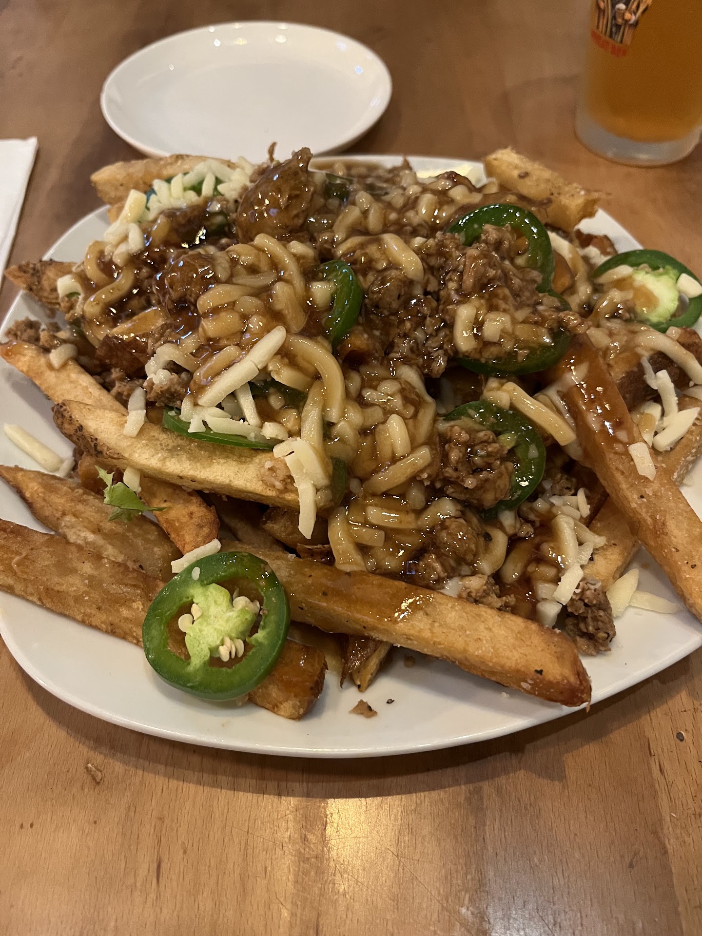 We started with the Poutine, adding fresh jalapeño and chorizo. Absolutely amazing combo and our love of heat was not disappointed. Our entrees were the Pork Shank and the Chef Special, Braised Lamb Shank. Both came with a risotto; Parmesan and mushroom respectively. Both meats were perfectly prepared and delicious. The risottos were delightful and not heavy. The pork shank was paired with asparagus and it was great. Lamb shank definitely would have benefited from a vegetable, but the portion was large so it wasn’t missed.
