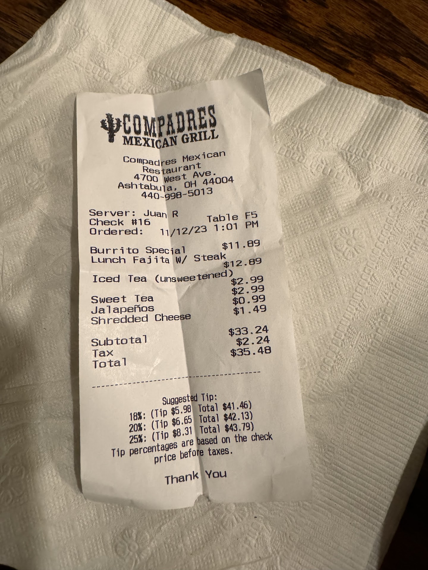 Read moreHave visited Compadres several times over the last 5 years. Have enjoyed good Mexican food. Live in Ashtabula. IN the past year, something bad has happened to the quality of the food. The refried beans seemed to have been run through a blender. No beans in the serving, didn't look real. Like made from a box, tasted awful! I put chip dip in that mess to give it flavor. The steak strips ordered medium, were well done, the shrimps were cooked in the meat juice ruining the shrimp taste, the meat gravy was poured over every thing in the burrito, including the melted cheese with large cheese lumps. THE chopped lettuce looked and tasted as though it was chopped last week, not crisp. Tomatoes mushy. The meal was apparently prepared by an Amateur. I wrote this detailed report to show just how disappointed I was. I should have gone to Panda Buffet. I still tipped the waitress. I will tiptoe into the restaurant to ask questions before purchasing a meal....