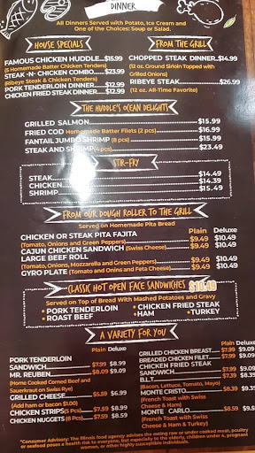 Read moreThe Huddle is so totally unpretentious that you just might think you've gone back in time. It's the same little downtown eatery we all flocked to half a century ago, and the food and service are just as comfortable. Good soups, usually included with your entree. Daily specials, Senior savings selections, peppermint ice cream . . . . The only caveat might be that it's pretty noisy, not a quiet spot to reflect and have important conversations, at least during busy meal times. There is a separate room that can offer a bit more sedate experience. Just stop on in and enjoy...