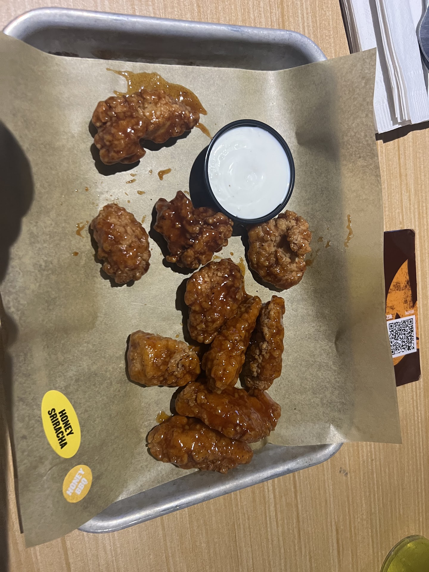 At about 8:30 my food was delivered to my table. The people that had sat down just a minute or two before I did were already done eating their entire meal at this point. The food was hot and tasted good but that was the only upside to this experience. I had to ask for an additional container to put my bones in because apparently at this B-dubs they feel you should just put your chewed bones back on the same tray as the food you are going to eat. I also had to flag down a server to get a refill on my ice tea... again I want point out that I had been sitting there for an hour at this point and other than having the bartender take my order and explain why it was taking so long I had no other contact with any employee.