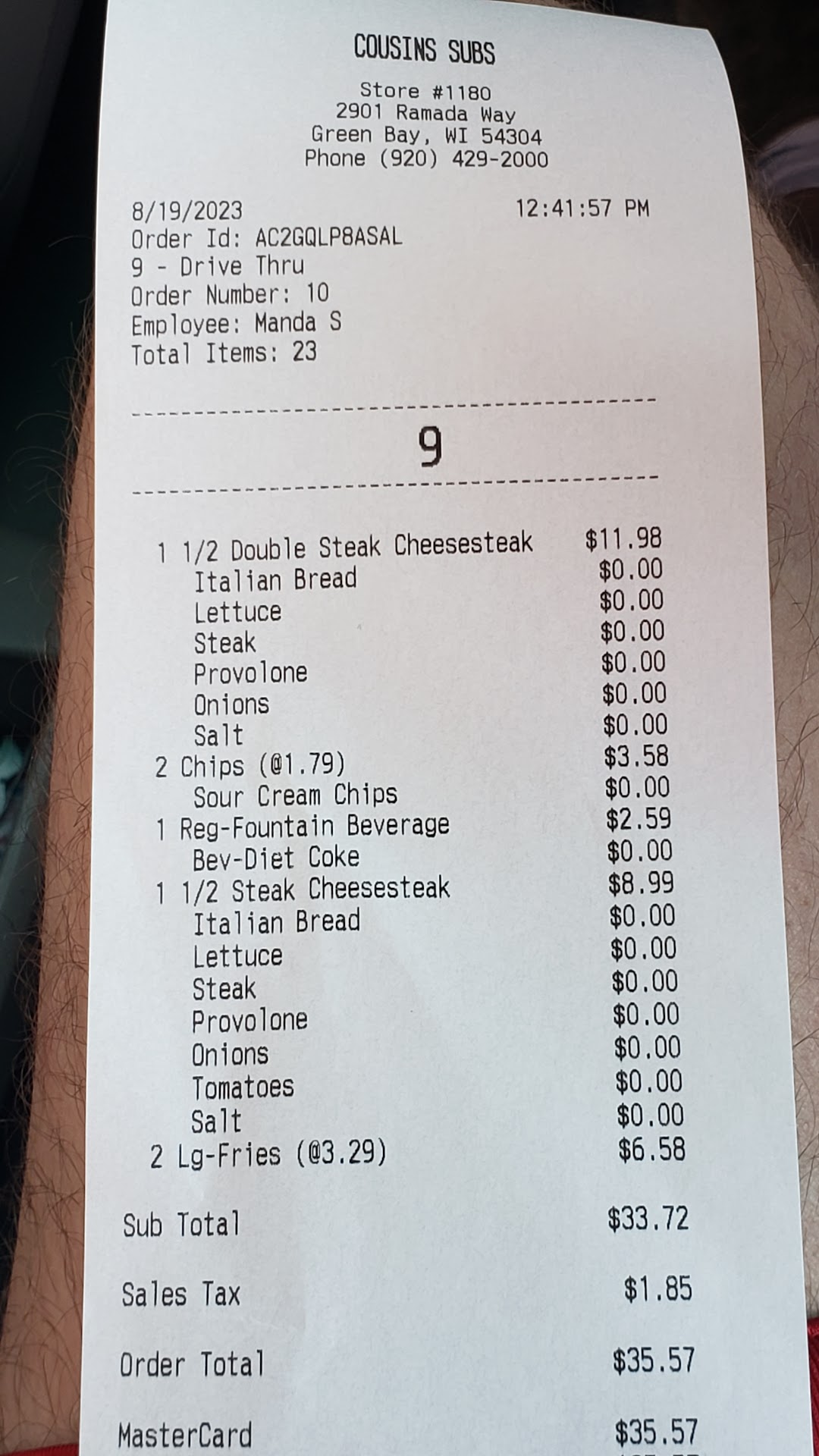 Was the only one in the drive thru and still had to wait 9 minutes to get my food. And, of course, there are no napkins in the bag when the oil is already leaking through. Also, their prices are just as bad as Jimmy John's. Over $10 for a half sub chips, and a small drink. That is out of control. And yes, cousins is my...