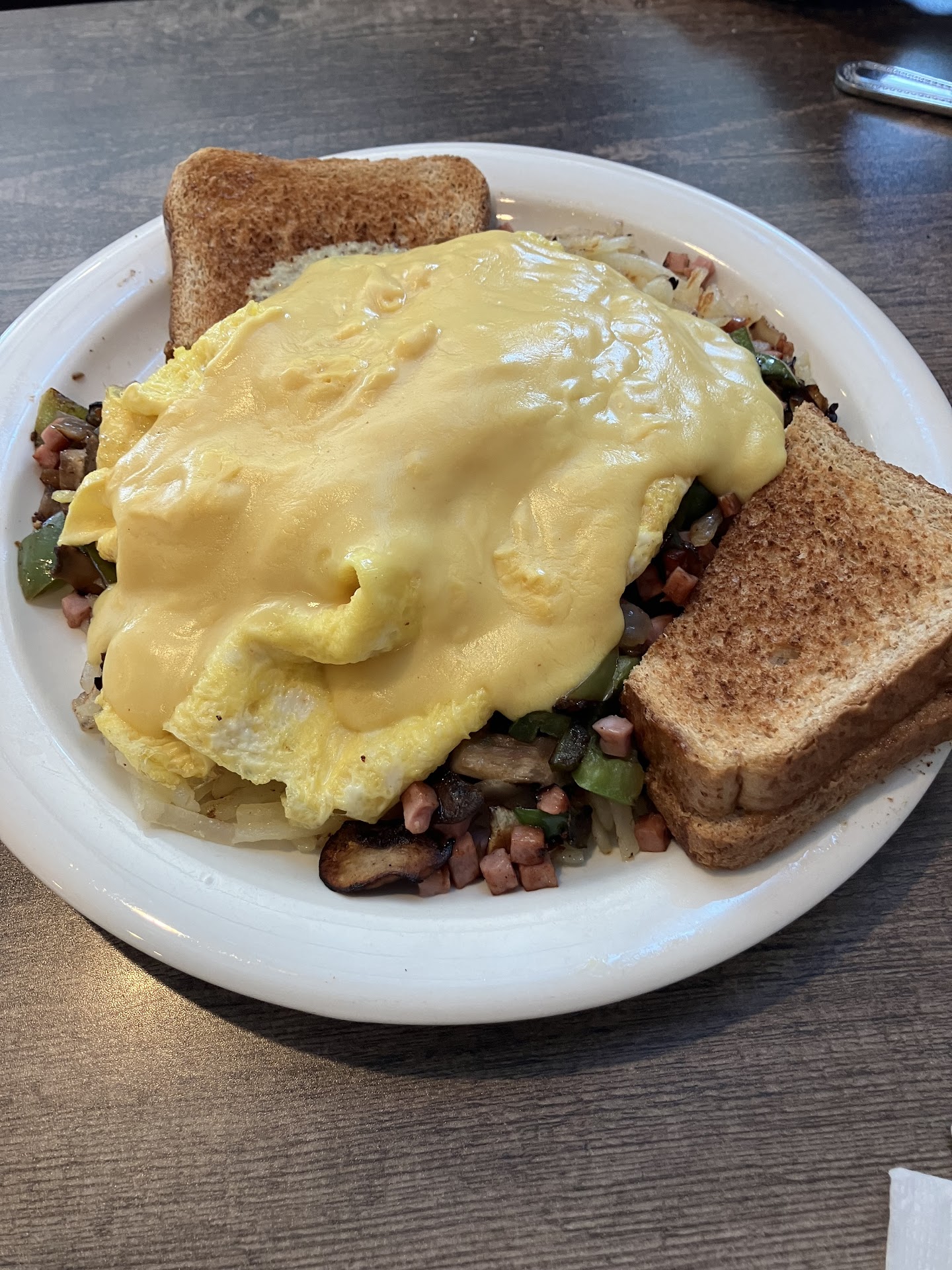 Our waitress (who was working her butt off) was very kind and a joy to her customers. The coffee was good, and the food was great! We both had Mexican omelettes. Hot and fresh ingredients. Portion sizes are very generous. Salsa has a kick in a good way.