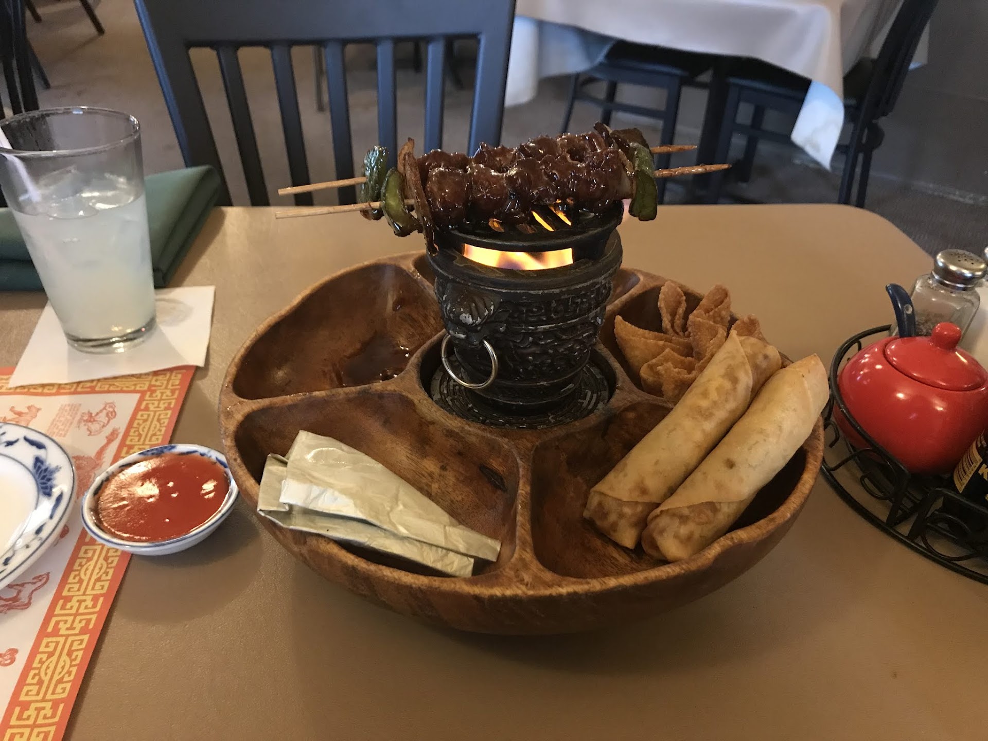 This particular visit, my partner and I tried new items on the menu. We first ordered the Pu Pu Tray for Two as an appetizer (see image below). This included 2 egg rolls, 2 crab meat rangoon, 2 paper wrapped chicken, 2 butterfly shrimp and 2 teriyaki beef sticks. We usually don't like egg rolls but these were not bad. There was no actual crab meat in the rangoons but they were pretty good. The wrapped chicken was plain - could have used a sauce on the side. OH MY GOSH the teriyaki beef sticks were to DIE FOR! They were sooooo good, we wish we ordered an entire side of them. Next time we go we definitely will!