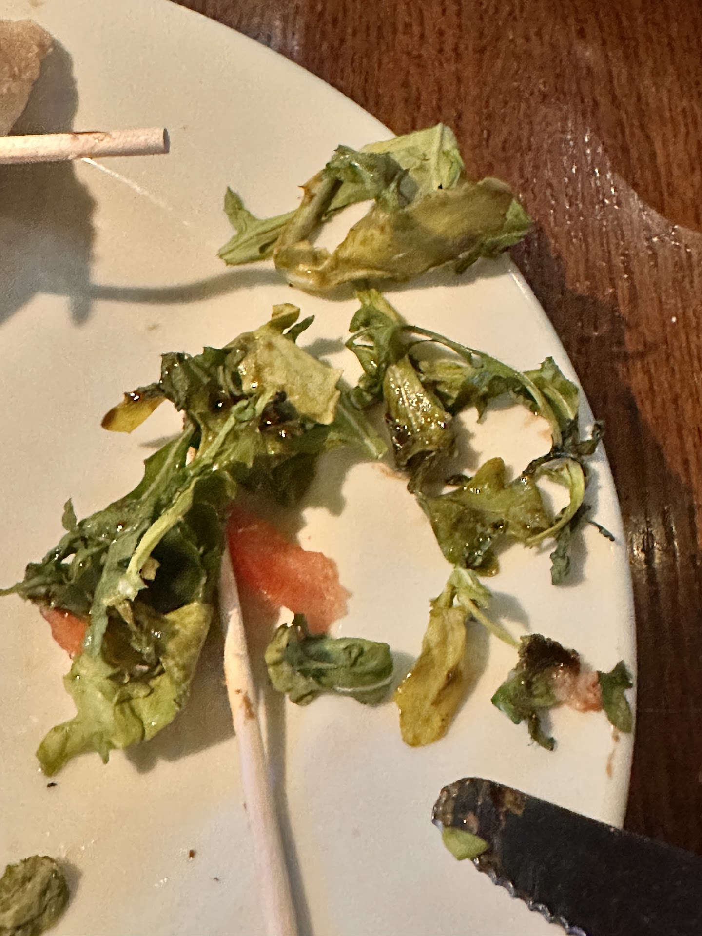 My brother and sister had ordered two side salads with their orders. After a period of time goes by, we start to wonder what's taking so long. At this point, we're probably an hour in. All we have gotten are waters and appetizers. Finally, the side salads arrive. Then my stepfather's soup finally gets there. So things are looking up, right? HAH!