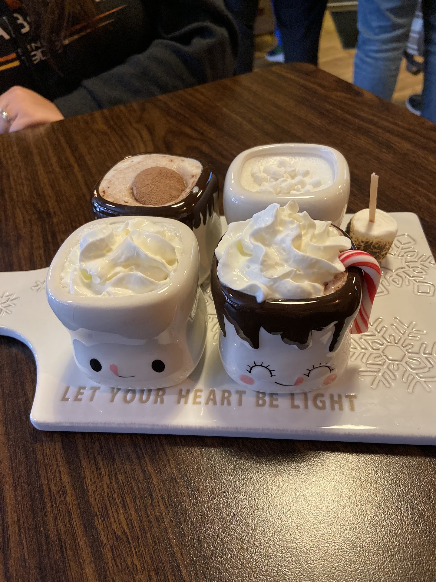 We ended up ordering the hot cocoa flights, which change flavors seasonally. I believe the four flavors were as follows - double chocolate hot cocoa, peppermint hot cocoa, toasted marshmallow hot cocoa and white mocha hot cocoa. It took the employee 20 minutes before we received our order for reference. The presentation was really cute, all the cups were Instagram worthy for sure ;)