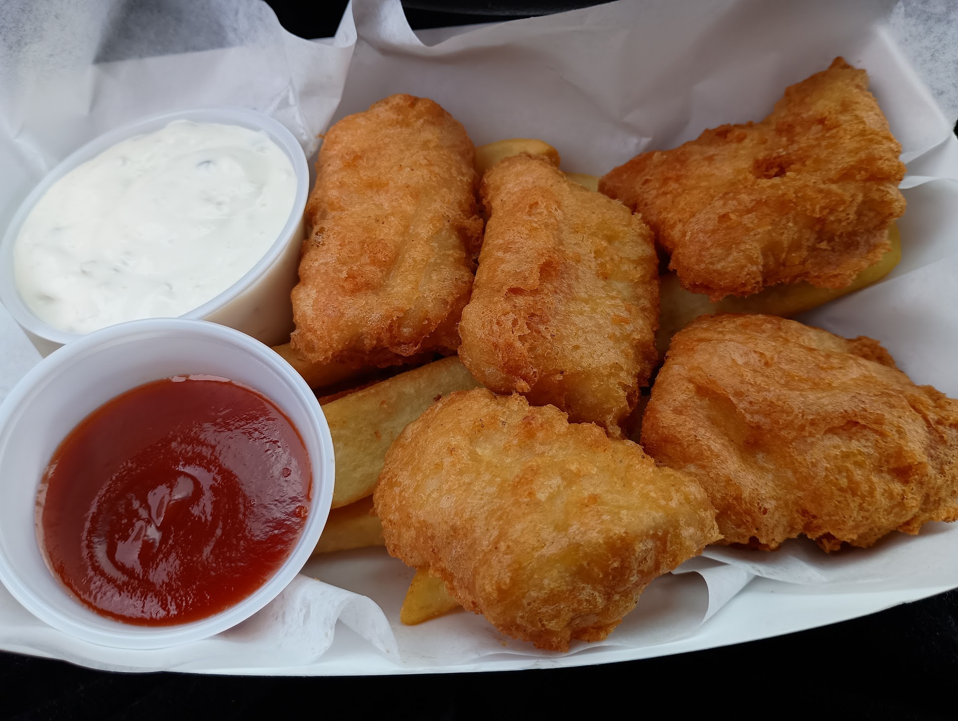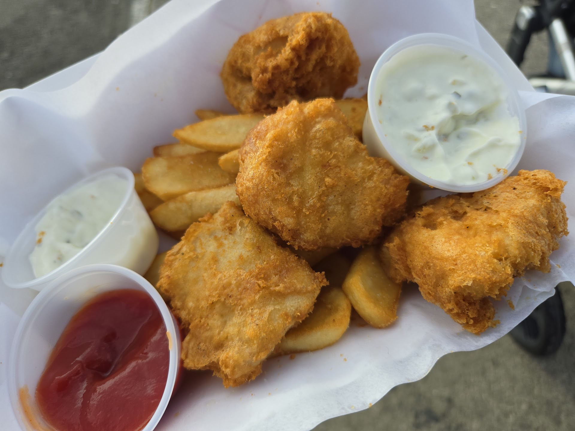 Read moreWe've been around the Astoria for years now. We never tried the Bowpicker. But today we were in town and decided to try it. It's every bit as good as we heard it is. We both got the 5 piece fish-n-chips with a soda. I asked for extra tartar sauce and she gave us each the larger PC cup full of it. The fries were crunchy outside and soft inside. Now to be fair it's clear they're not making these fries here. They're ok, just not great. But the real star of the show is the fish. The fish was coated with a batter and fried perfectly crunchy. The moist and soft fish was fresh tasting. I'm not sure what fish they use. While I was waiting for my order I noticed as I was looking back in the prep and cooking area that there were several cans of natural ice beer open sitting on the counter back there. This leads me to believe that they are making a beer batter for the fish. I also think that they are making the batter in smaller batches more often so the fish is always fried in a batter that's freshly made. I asked for extra tartar sauce and they gave me a larger PC cup of it. I felt like it needed more lemon juice in the tartar sauce. I can't tell if they're making it or buying the tartar sauce in. I could've used more ketchup, they give you a small PC cup halfway full of ketchup. The soda is in cans and they do not have cups or ice. There aren't any tables here so you have to eat in your car or find somewhere else to sit. This is a full on boat they're operating out of. It still sits on the trailer as you can tell in the pic. We'll be back. There's usually a line of people waiting to order so be...