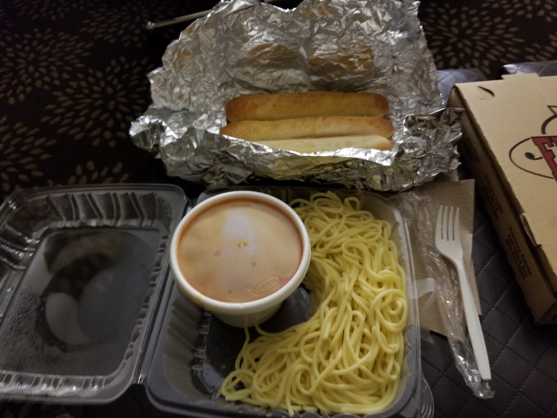 We were left waiting, with our food getting cold and when we complained about the bad service we were insulted. When we got back to our hotel the food wasn't very good either. They left out any parmesan or pepper packets, the sauce for the spaghetti was bland, sour and very off putting. We wouldn't have ordered breadsticks if we had known the spaghetti came with some, and said breadsticks were also bland and doughy.