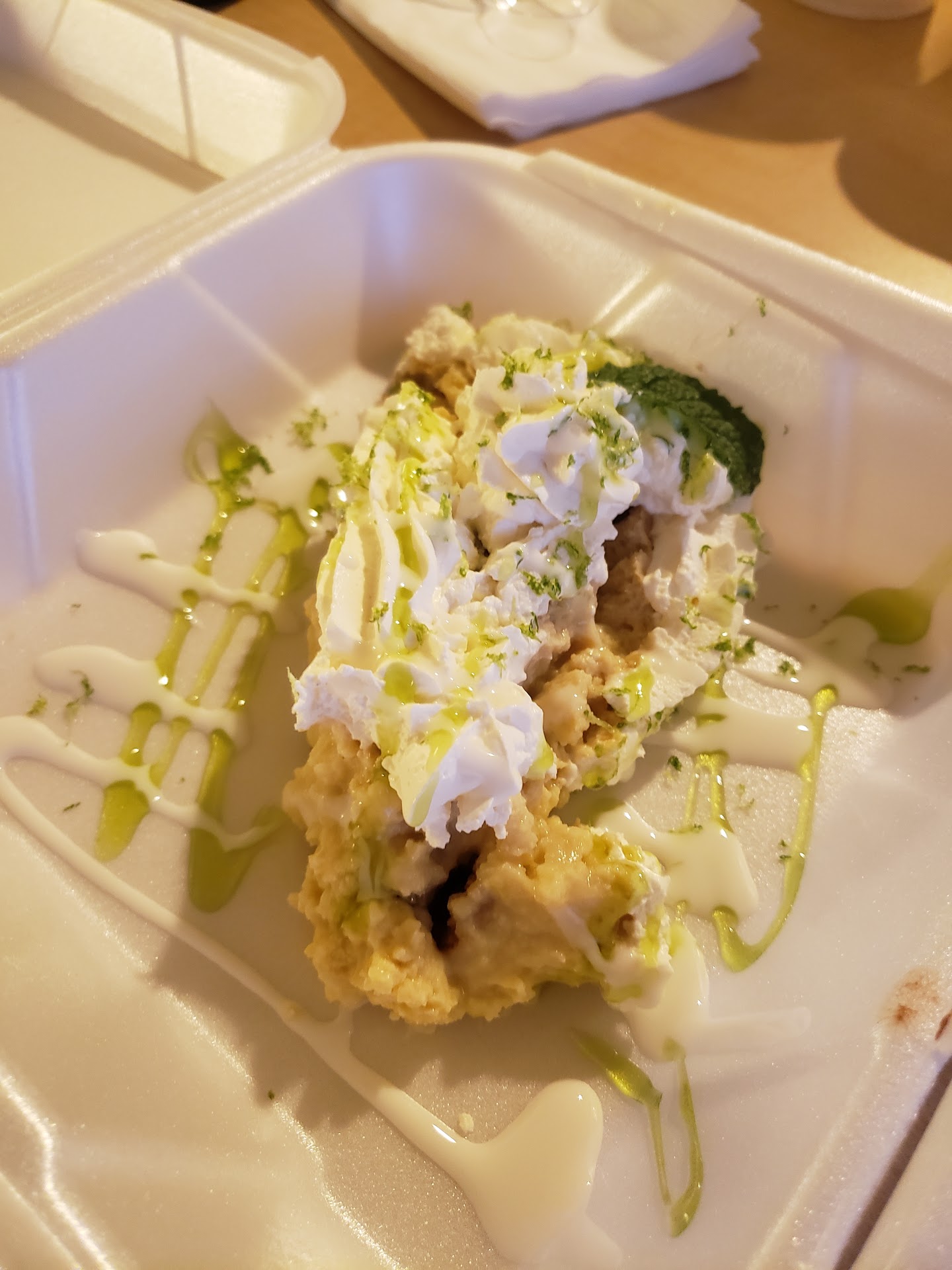 Read moreThe staff was amazing, the wine list was solid, and some of the food was edible. Unfortunately, that's about all that can be said in favor of the Silver Salmon dining experience. We entered the lobby with a reservation and saw that the restaurant was not obeying social distancing in any way, shape or form. The owner came up to take us in, and she was wearing her mask only over her mouth. We said we were not comfortable dining in, but would love to put in a take out order if that were possible. She courteously said of course, brought the bartender over, who was also very kind, and we placed an order for one fish and chips, with a side Caesar salad, and one blackened salmon & garlic mashed potatoes with chowder. The bartender also offered a dessert selection, for which the presentation was very nice, and we selected the hazelnut brownie sundae and the key lime pie. We also purchased a bottle of Oregon wine. Flash forward twenty minutes or so, we received two bags with our order and left on the 3.5 minute drive to our residence. Upon arrival, we saw that we had received the entrees but not the side dishes (Caesar salad, clam chowder). The chips and fish were soggy in a way that suggested they had not been cooked thoroughly - the minimal amount of condensation inside the clamshell and complete lack of browning on the fried items indicated the undercooking. The salmon was well cooked but the mashed potatoes were, ahem, chunky with huge uncooked pieces of potato that felt like biting into a crisp apple. Not pleasant. "Well, at least we have dessert!" we thought! Alas... Dessert was possibly more depressing than dinner. I attached photos of the "slice" (more of a pile) of key lime pie I received. I held the desserts stable on the way home and in no way did I cause damage to them. I simply cannot believe a reputable establishment would serve something that looked like this. Additionally, the hazelnuts were absent from the brownie. The brownie has the texture and taste of a box mix. All in all a very disappointing dinner. TLDR: Save yourself from the disappointment and...
