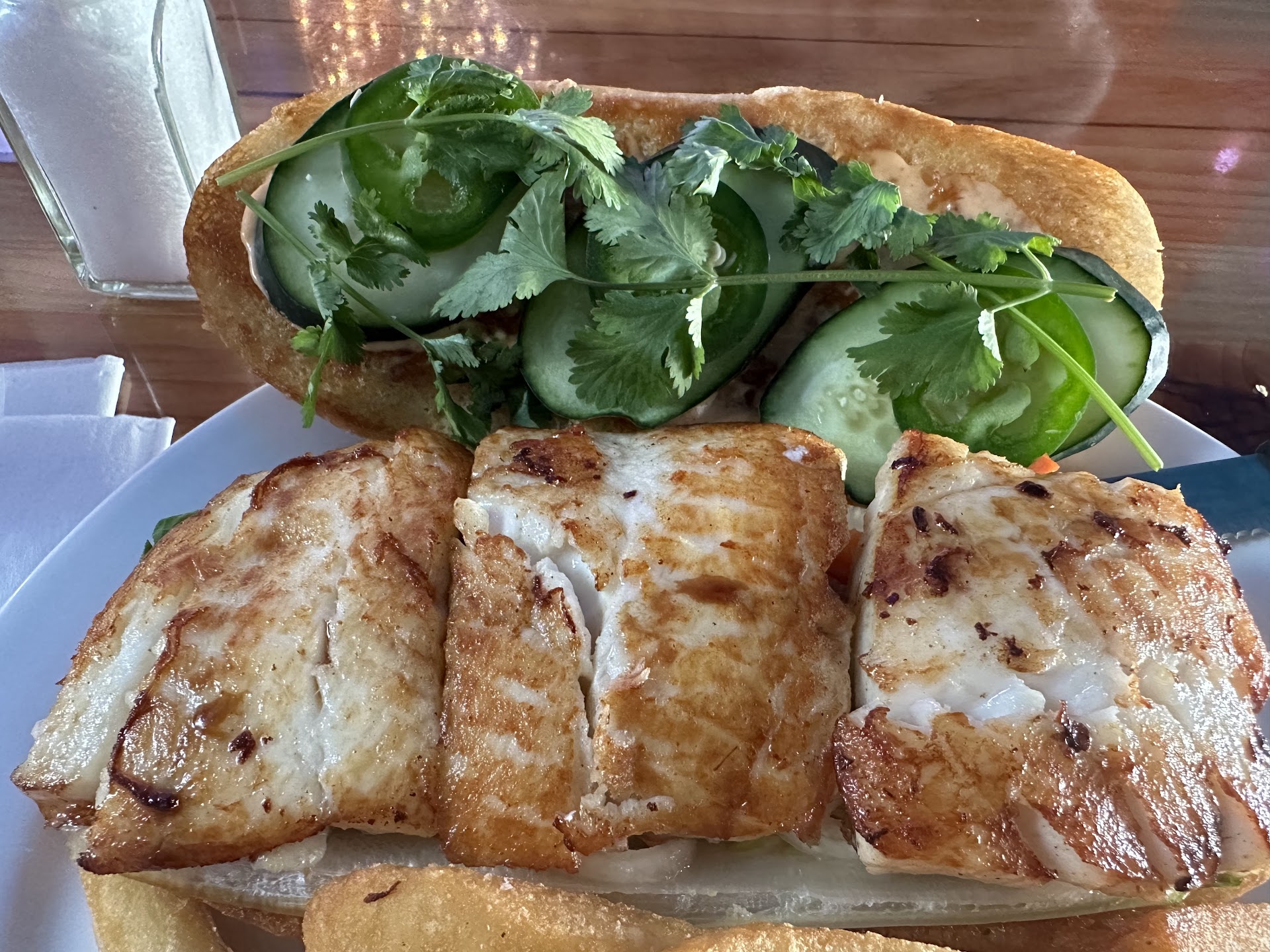 Read moreWe had Lady Luck on our side. We were lucky to find this place for dinner this evening. The other lucky part is that we were literally the last people that got in for dinner tonight. This place is so busy they have to cut the line off since they close at 8pm. At worst case they would have let us order to go but we didn’t want dinner in our room. The food was super fresh and creative. I had the Grilled Petrale Sole Banh Mi Sandwich. The fish was made to perfection and the roll they used had a nice flavor and complimented this Vietnamese Sandwich. This was served with a good helping of those Steak Fries that were cooked just right. It was one of the best grilled fish sandwiches I’ve ever had. My wife had the Grilled Rockfish Tacos. The chef warms up the corn tortillas in a little oil on the grill. The tortilla is soft but has a little texture which keeps it together for every bite. Tasty and 3 fairly large tacos - Definitely a meal.