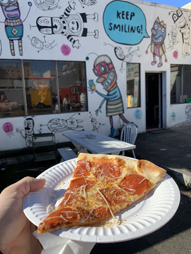 The shop has a fun, casual vibe, with a few tables for eating in, a counter top seating area and the outside food cart benches. It's the perfect spot for a quick lunch, a snack on the go, or a late-night slice after a night out.