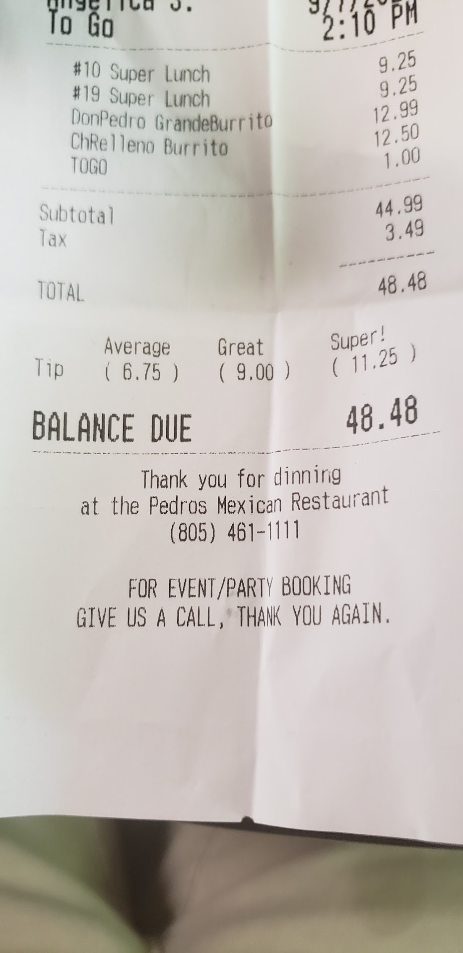 Food was ok. Problem was customer service. It was terrible. We waited 35 minutes for our food - table of four of us. When we did get our food, one of the orders was wrong - ended up with a number 9 instead of a number 19. Then we had to wait 20 minutes for the number 19 to arrive. By then, the rest of us were pretty done. When it was time to check out we had two separate checks. The couple we were with had a $3 coupon and we had a $5 coupon. The waitress told us we could only use one coupon per table and she had applied the lesser $3 coupon to the other couple’s check but gave us (the couple with the incorrect order) no credit for the coupon nor did she apply any comp for the mistake in the order. She identified herself as the manager, said it was a mistake, so we wouldn’t get any credit. Turned out it was her mistake - she’d written #9 for the order instead of 19 - we saw this on the bill. But, she must have heard #19 correctly because she did give us the salad that is included with the #19 dinner, but not included in a #9. What restaurant wouldn’t want to make this experience right? We’ll go down the road for dinner next time. There are way too many Mexican restaurants in Atascadero with comparable food quality to be...
