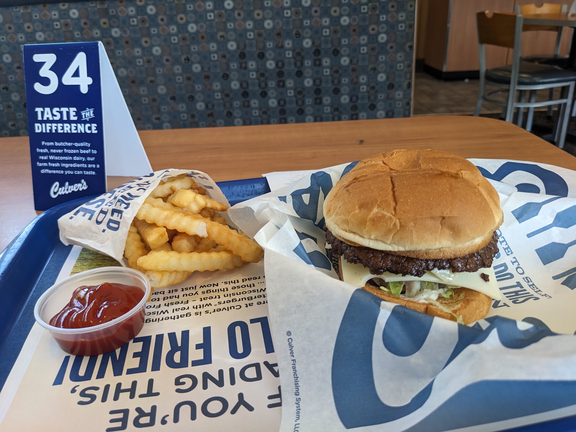 Read moreFirst time trying Culver’s. In general, the food was good and so was the customer service… with the exception of the guy who gave me my food. I had to wait in line in front of four cars, after paying through drive thru. I didn’t have know how long the wait would be, since it was my first time there. I received a notification I had to pickup a last minute item that I had for my own job. I needed to make this pickup myself, so I felt it was best to do it now and come back right after; The drive was 2 minutes away, and I would just come back to get my food in person.