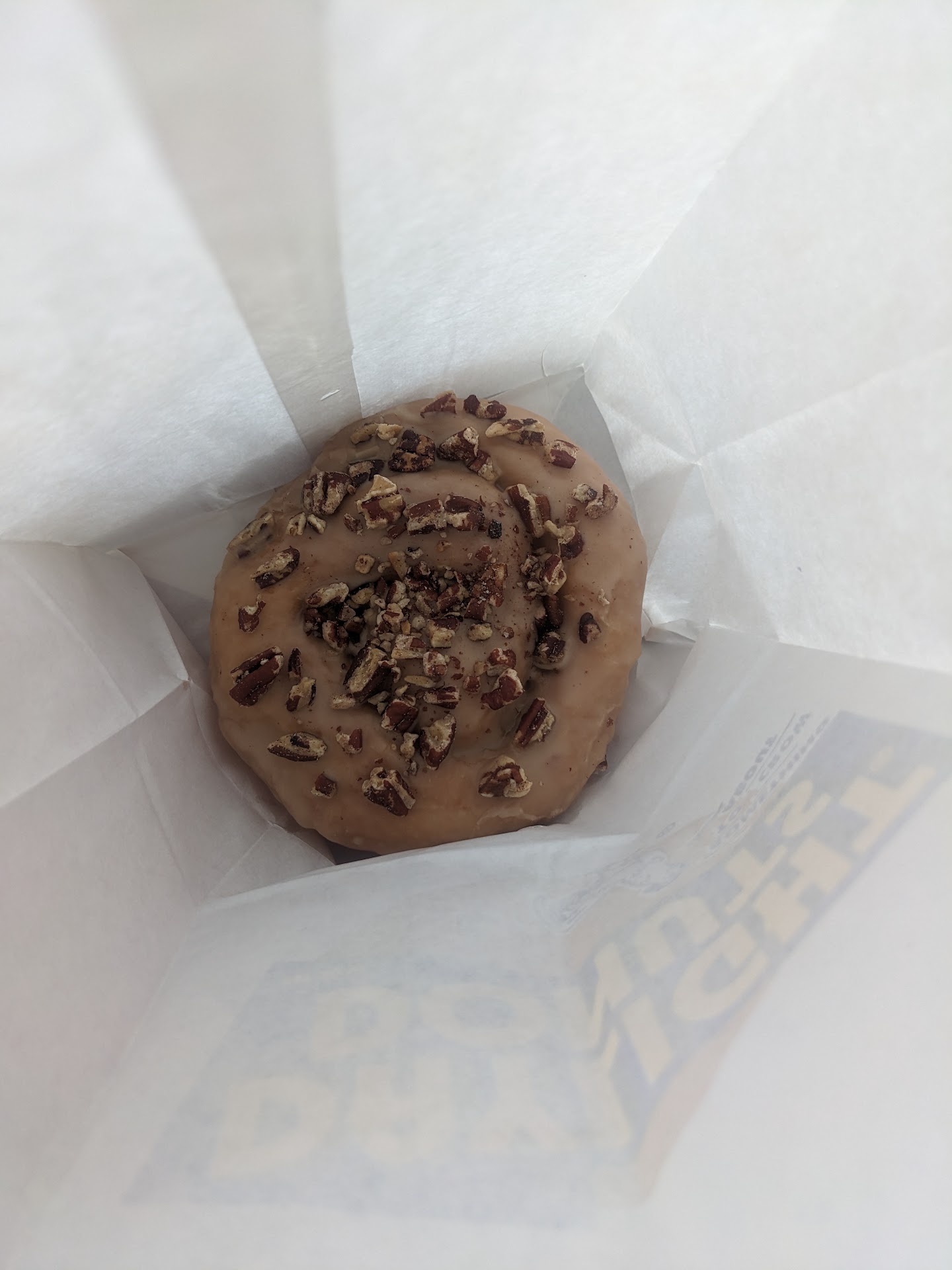 The donuts and service from the lady up front was good. I did not appreciate the cracker jack front entry way, it's extremely small and awkward, and that is the way you order the donuts. Your behind a plastic divider and the front door is closed to a dining area which does not seem like they want you to come inside. I know we live in this covid era but it's not welcoming and it's not easy to even see the donuts , they are not labeled and far away so you basically cant see them on display, the lady has to tell you what they are if you can them and describe them! It's very weird. They should open up and treat this like a happy place so people can enjoy a happy place with donuts! As it should be. I would not go back, because of the lack of ambience...
