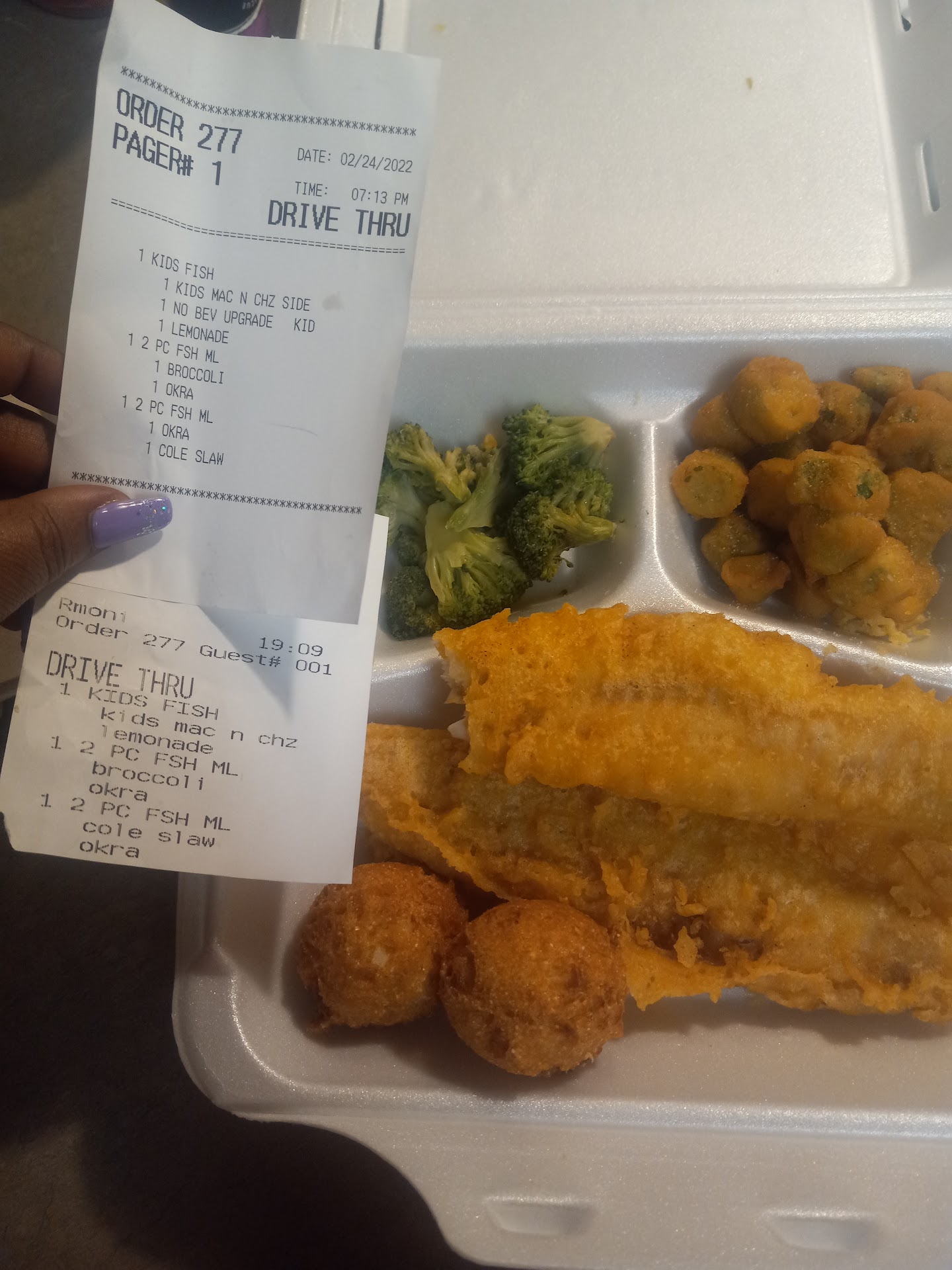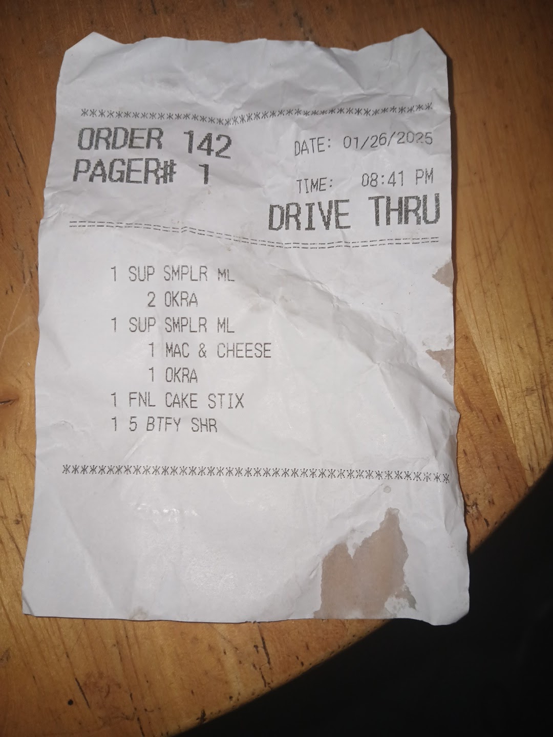 Read moreI have Epilepsy I should start off saying. I went through the drive-through last night 01/26/2025 at 8:41 pm. I ordered 1 super sampler with double okra as the sides 1 super sampler with Mac and cheese and okra as the sides. 1 order of funnel cake sticks and 5 butterfly shrimp. I expected to receive what I ordered. I had a seizure when I left Captin D establishment. I took my meds when I got home and was so drained, and out of it, I went to sleep. When I woke up today, I called and talked to a manager. She didn't give a name. I called back and spoke to Christy, the GM. I even apologized, and my phone dropped the call.