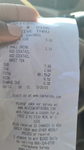 Read moreLunch time at Captain D's with a friend. The interior looks a little dated but it was clean.