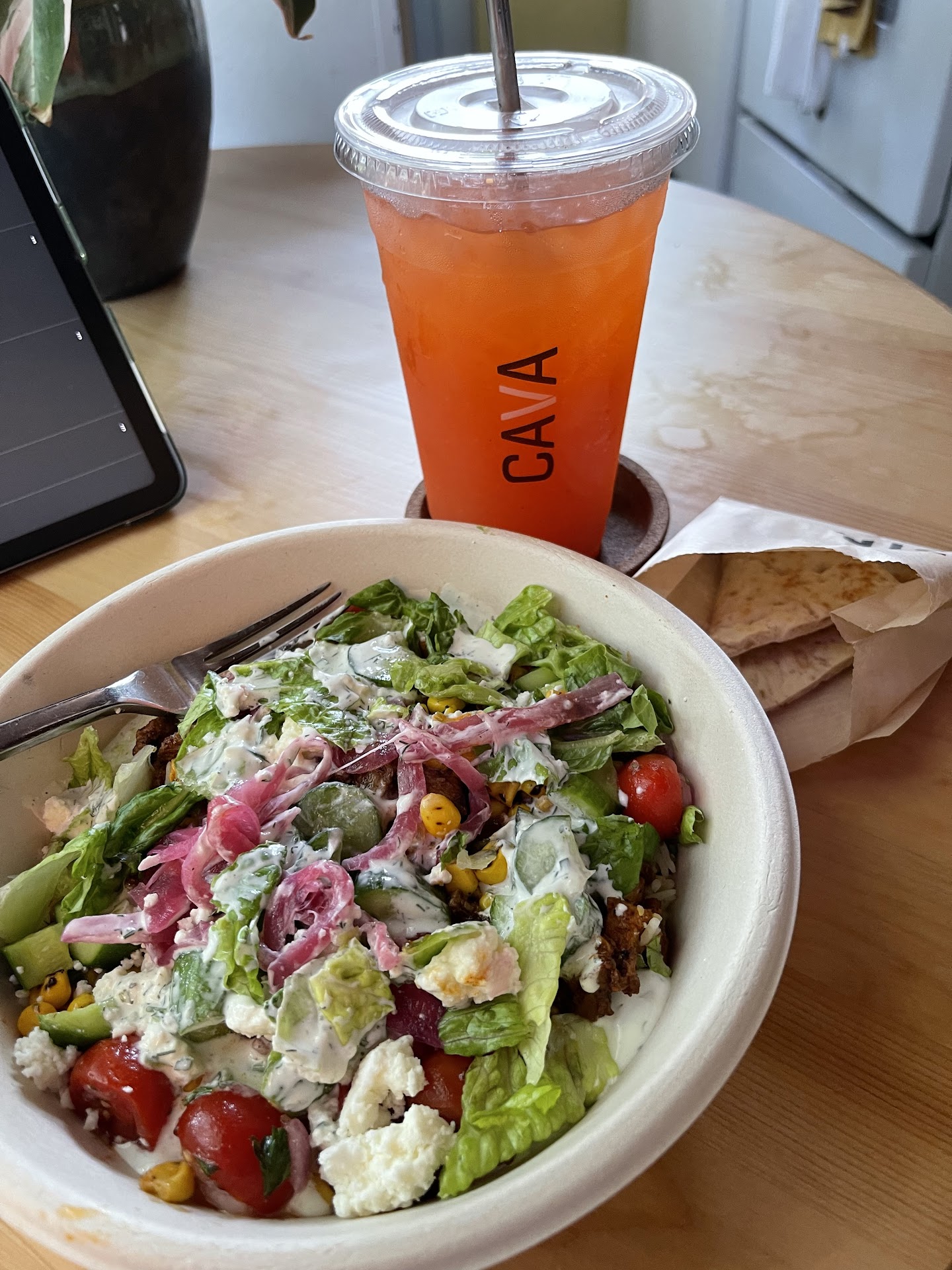 My favorite meal to order has always been the greens + grains bowl, though obviously I have ventured through the entire menu and love all options. I highly suggest getting the harissa chicken and pairing it with the tzaziki, hummus, and crazy feta dip, then finishing it up with any toppings of your choice (personally, I find the pickled onions to be a necessity). And lastly, any lover of CAVA knows the seasonal juices + teas are to die for.