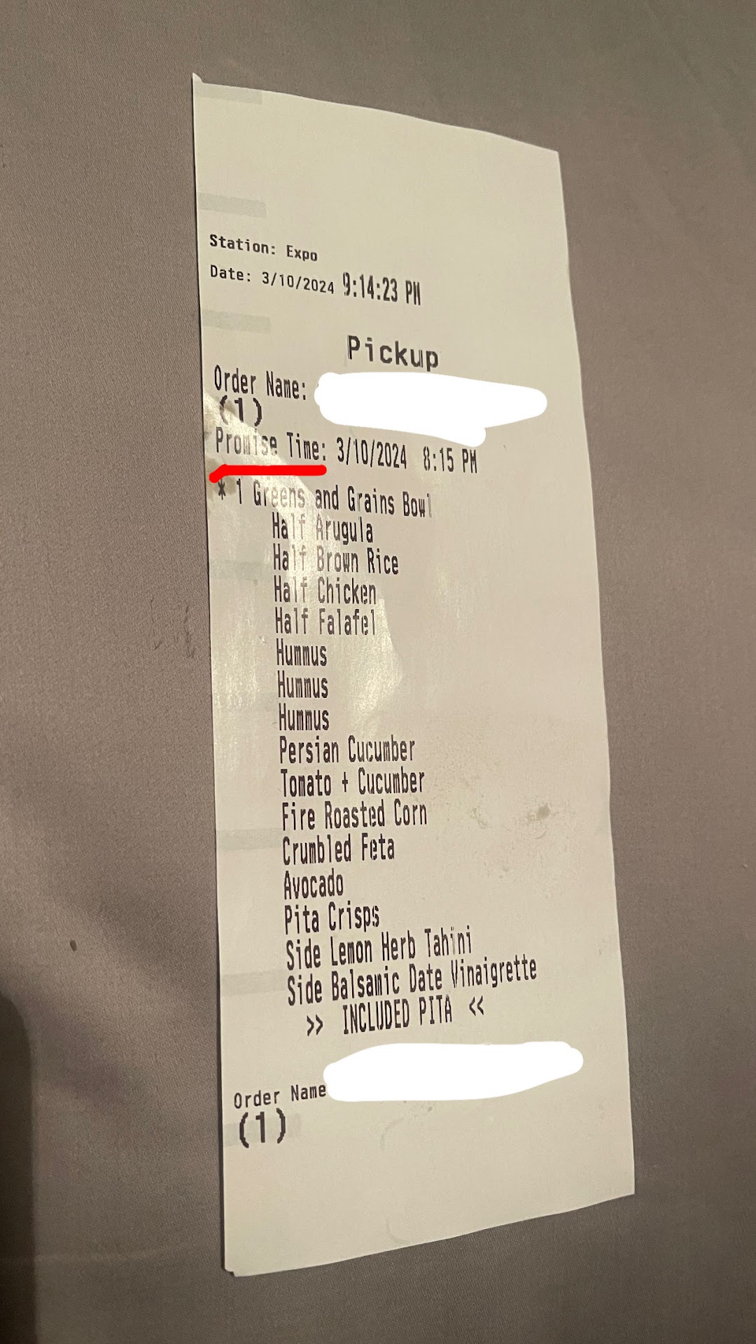 Underlined in red in the receipt photo I have included, you can see the âpromise timeâ. Cava, you did not fulfill this promise.
