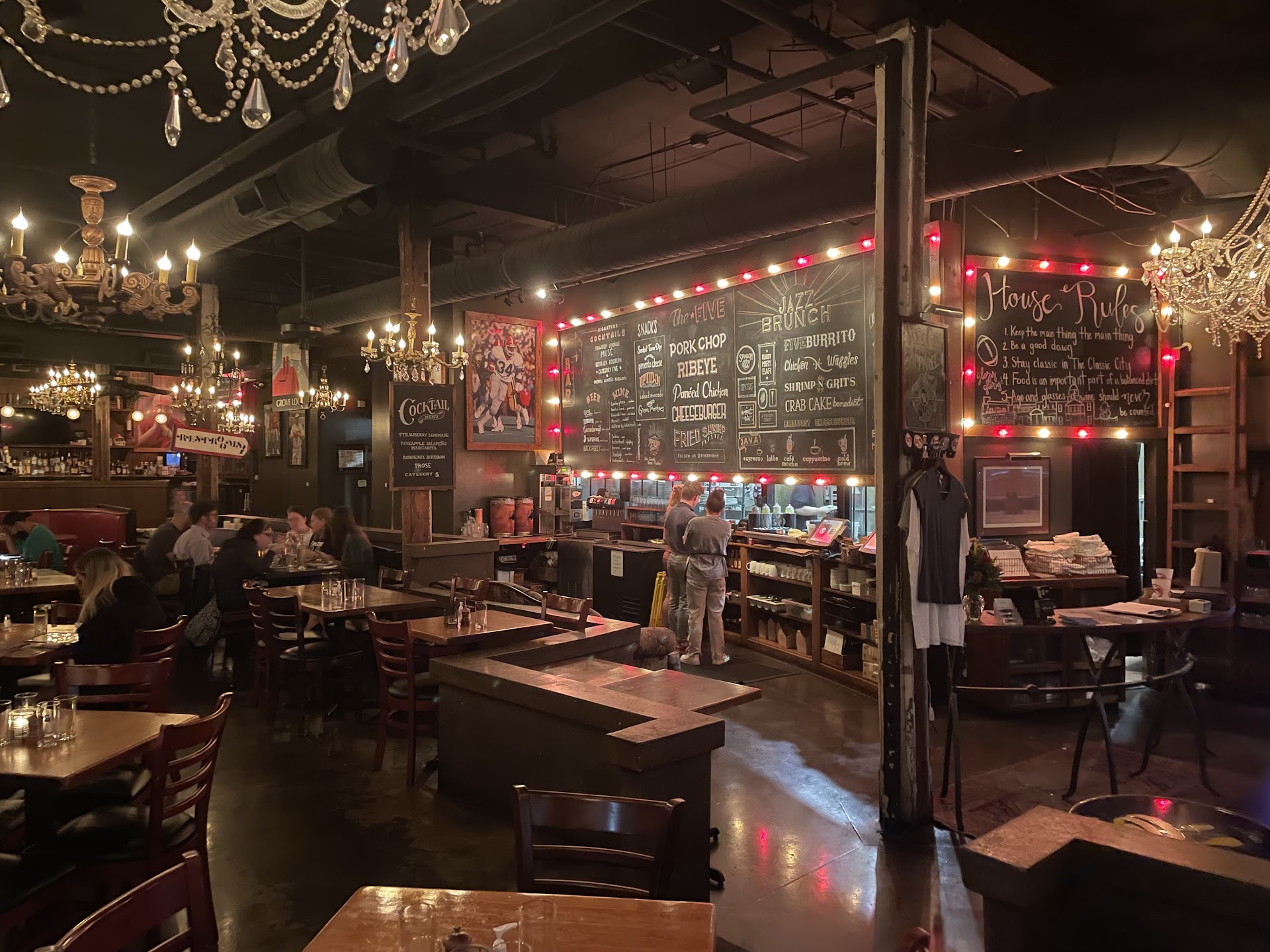 When we had ordered our dishes at the same time as our drinks, the birthday girl and another person in our party had each ordered and requested breakfast burritos with no bacon and sausage inside because they're both vegetarians. The birthday girl took one bite when we got our food and immediately bit into sausage and when we opened the burrito, there was meat everywhere in it. So the waiter took it back and they remade her burrito.